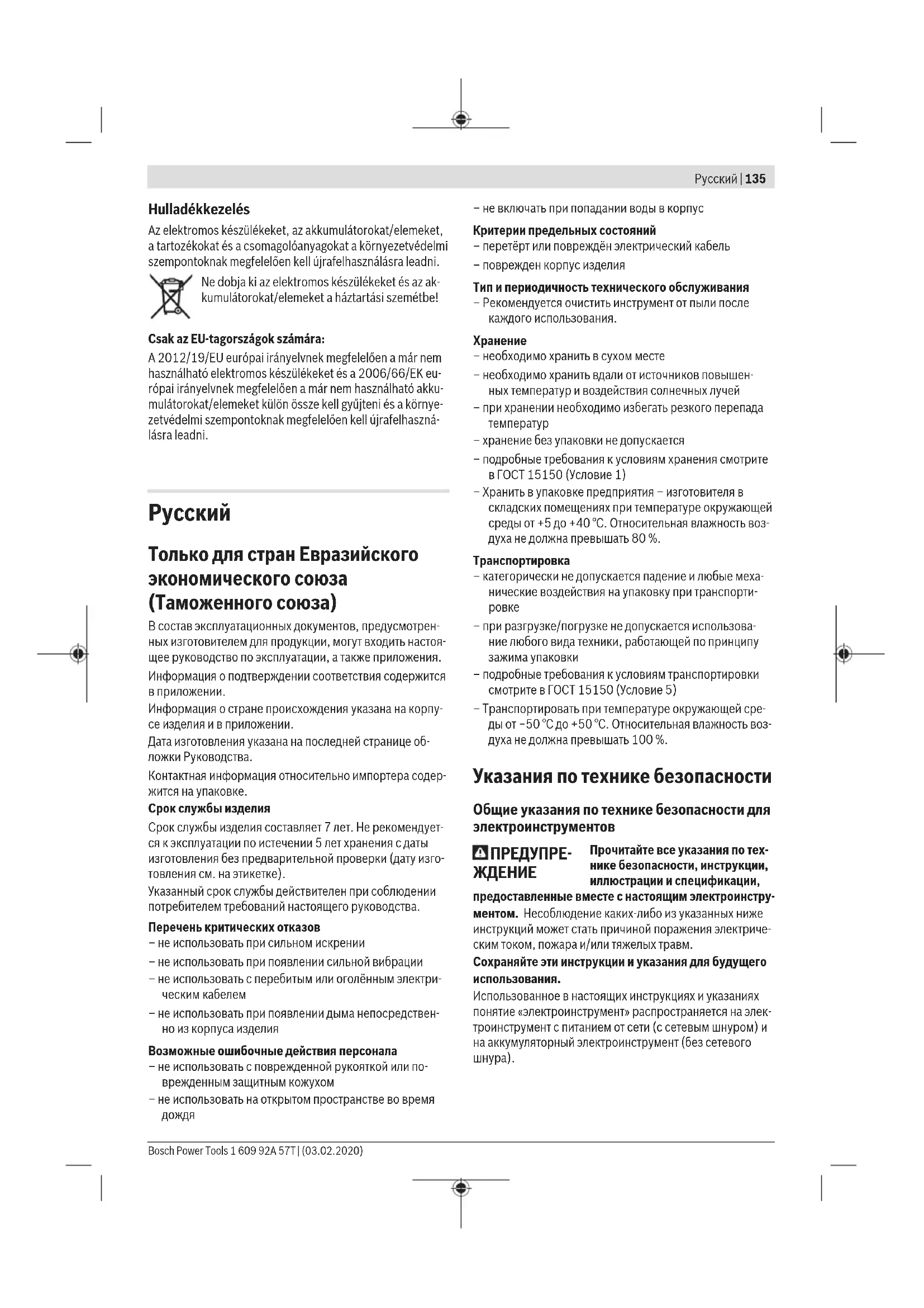 Toлько для стран Евразийского экономического союза (Таможенного союза) В состав эксплуатационных документов, предусмотрен- ных изготовителем для продукции, могут входить настоя- щее руководство по эксплуатации, а также приложения. Информация о подтверждении соответствия содержится в приложении. Информация о стране происхождения указана на корпу- се изделия и в приложении. Дата изготовления указана на последней странице об- ложки Руководства. Контактная информация относительно импортера содер- жится на упаковке. Срок службы изделия Срок службы изделия составляет 7 лет. Не рекомендует- ся к эксплуатации по истечении 5 лет хранения с даты изготовления без предварительной проверки (дату изго- товления см. на этикетке). Указанный срок службы действителен при соблюдении потребителем требований настоящего руководства. Перечень критических отказов – не использовать при сильном искрении – не использовать при появлении сильной вибрации – не использовать с перебитым или оголённым электри- ческим кабелем – не использовать при появлении дыма непосредствен- но из корпуса изделия Возможные ошибочные действия персонала – не использовать с поврежденной рукояткой или по- врежденным защитным кожухом – не использовать на открытом пространстве во время