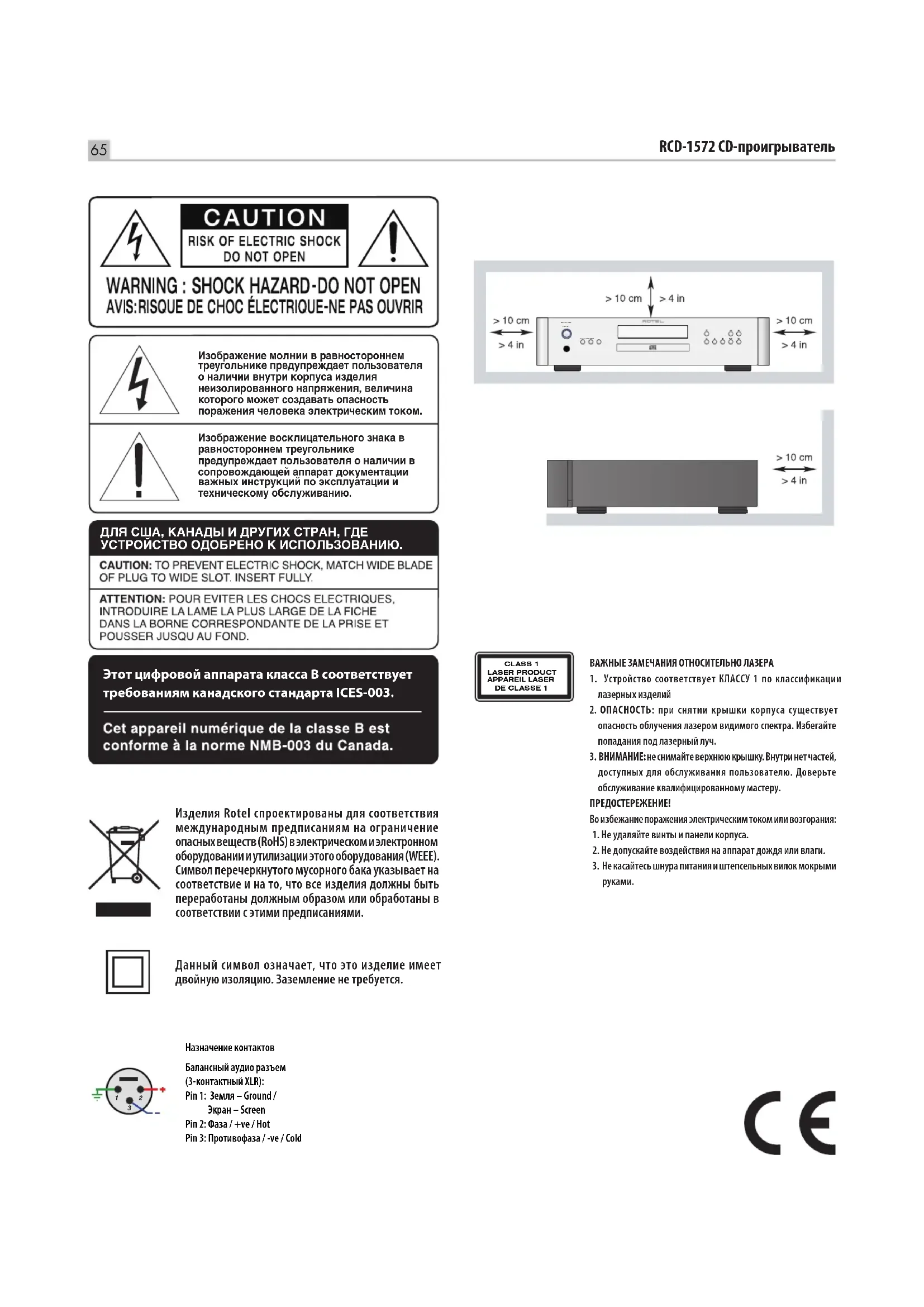 Назначение контактов Балансный аудио разъем (3-контактный XLR): Pin 1: Земля – Ground / Экран – Screen Pin 2: Фаза / +ve / Hot Pin 3: Противофаза / -ve / Cold CLASS 1 LASER PRODUCT APPAREIL LASER DE CLASSE 166