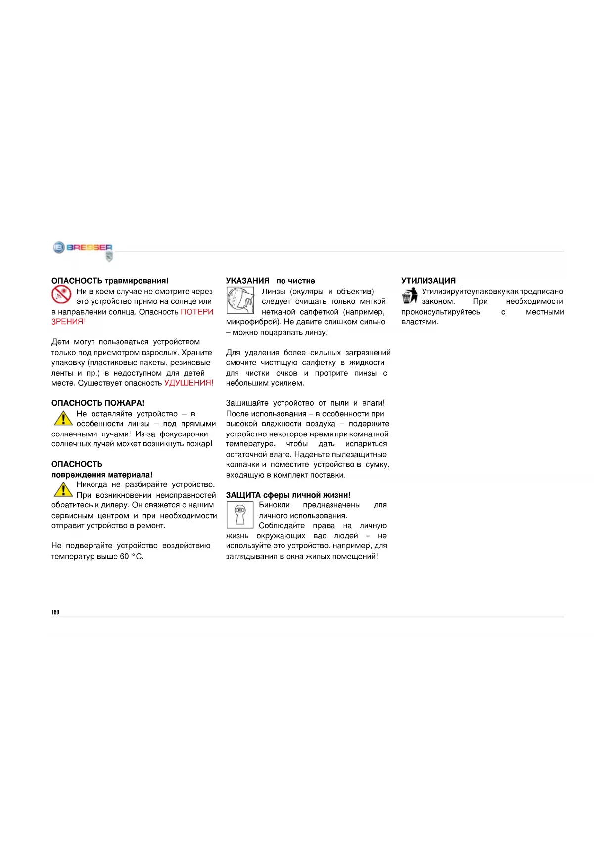 повреждения материала! Никогда не разбирайте устройство. При возникновении неисправностей обратитесь к дилеру. Он свяжется с нашим сервисным центром и при необходимости отправит устройство в ремонт. Не подвергайте устройство воздействию температур выше 60 °С. УКАЗАНИЯ по чистке Линзы (окуляры и объектив) следует очищать только мягкой нетканой салфеткой (например, микрофиброй). Не давите слишком сильно – можно поцарапать линзу. Для удаления более сильных загрязнений смочите чистящую салфетку в жидкости для чистки очков и протрите линзы с небольшим усилием. Защищайте устройство от пыли и влаги! После использования – в особенности при высокой влажности воздуха – подержите устройство некоторое время при комнатной температуре, чтобы дать испариться остаточной влаге. Наденьте пылезащитные колпачки и поместите устройство в сумку, входящую в комплект поставки. ЗАЩИТА сферы личной жизни! Бинокли предназначены для личного использования. Соблюдайте права на личную жизнь окружающих вас людей – не используйте это устройство, например, для заглядывания в окна жилых помещений!