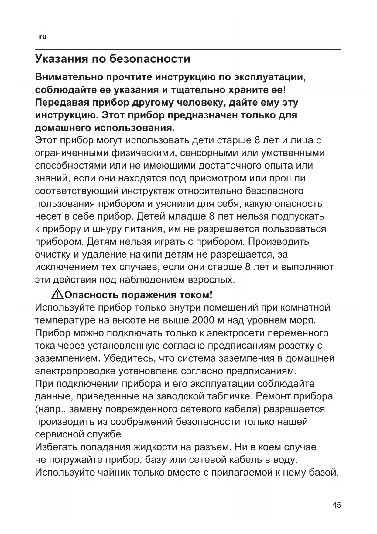 Указания по безопасности Внимательно прочтите инструкцию по эксплуатации, соблюдайте ее указания и тщательно храните ее! Передавая прибор другому человеку, дайте ему эту инструкцию. Этот прибор предназначен только для домашнего использования. Этот прибор могут использовать дети старше 8 лет и лица с ограниченными физическими, сенсорными или умственными способностями или не имеющими достаточного опыта или знаний, если они находятся под присмотром или прошли соответствующий инструктаж относительно безопасного пользования прибором и уяснили для себя, какую опасность несет в себе прибор. Детей младше 8 лет нельзя подпускать к прибору и шнуру питания, им не разрешается пользоваться прибором. Детям нельзя играть с прибором. Производить очистку и удаление накипи детям не разрешается, за исключением тех случаев, если они старше 8 лет и выполняют эти действия под наблюдением взрослых. WОпасность поражения током! Используйте прибор только внутри помещений при комнатной температуре на высоте не выше 2000 м над уровнем моря. Прибор можно подключать только к электросети переменного тока через установленную согласно предписаниям розетку с заземлением. Убедитесь, что система заземления в домашней электропроводке установлена согласно предписаниям. При подключении прибора и его эксплуатации соблюдайте данные, приведенные на заводской табличке. Ремонт прибора (напр., замену поврежденного сетевого кабеля) разрешается производить из соображений безопасности только нашей сервисной службе. Избегать попадания жидкости на разъем. Ни в коем случае не погружайте прибор, базу или сетевой кабель в воду. Используйте чайник только вместе с прилагаемой к нему базой.46