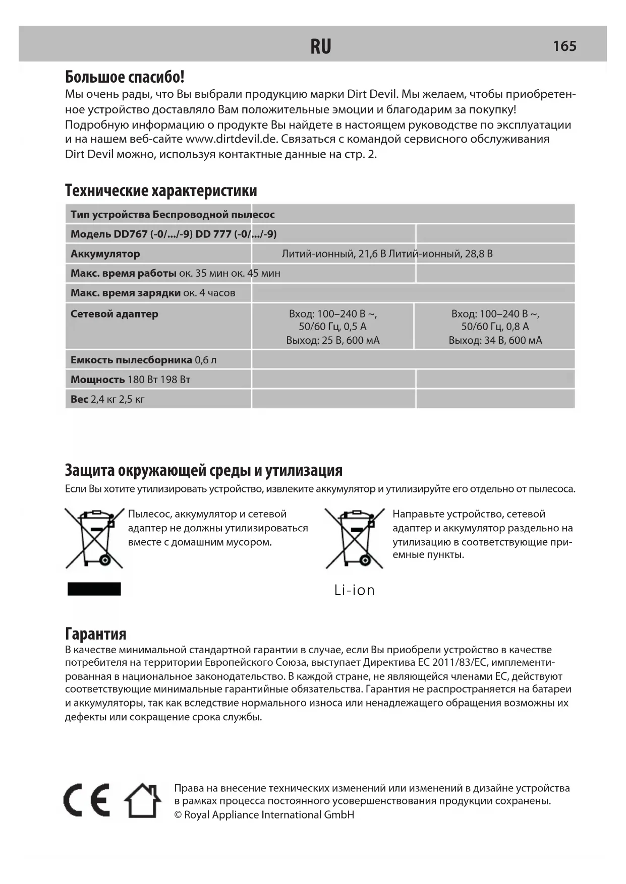 SIПрава на внесение технических изменений или изменений в дизайне устройства в рамках процесса постоянного усовершенствования продукции сохранены.© Royal Appliance International GmbH Большое спасибо! Мы очень рады, что Вы выбрали продукцию марки Dirt Devil. Мы желаем, чтобы приобретен- ное устройство доставляло Вам положительные эмоции и благодарим за покупку! Подробную информацию о продукте Вы найдете в настоящем руководстве по эксплуатации и на нашем веб-сайте www.dirtdevil.de. Связаться с командой сервисного обслуживания DirtDevil можно, используя контактные данные на стр. 2. Технические характеристики Тип устройства Беспроводной пылесосМодель DD767 (-0/.../-9) DD 777 (-0/.../-9)АккумуляторЛитий-ионный, 21,6 В Литий-ионный, 28,8 ВМакс. время работы ок. 35 мин ок. 45 минМакс. время зарядки ок. 4 часовСетевой адаптерВход: 100–240 В ~, 50/60 Гц, 0,5 А Выход: 25 В, 600 мАВход: 100–240 В ~, 50/60 Гц, 0,8 А Выход: 34 В, 600 мAЕмкость пылесборника 0,6 лМощность 180 Вт 198 ВтВес 2,4 кг 2,5 кг Защита окружающей среды и утилизация Если Вы хотите утилизировать устройство, извлеките аккумулятор и утилизируйте его отдельно от пылесоса.Пылесос, аккумулятор и сетевой адаптер не должны утилизироваться вместе с домашним мусором.Направьте устройство, сетевой адаптер и аккумулятор раздельно на утилизацию в соответствующие при-емные пункты.