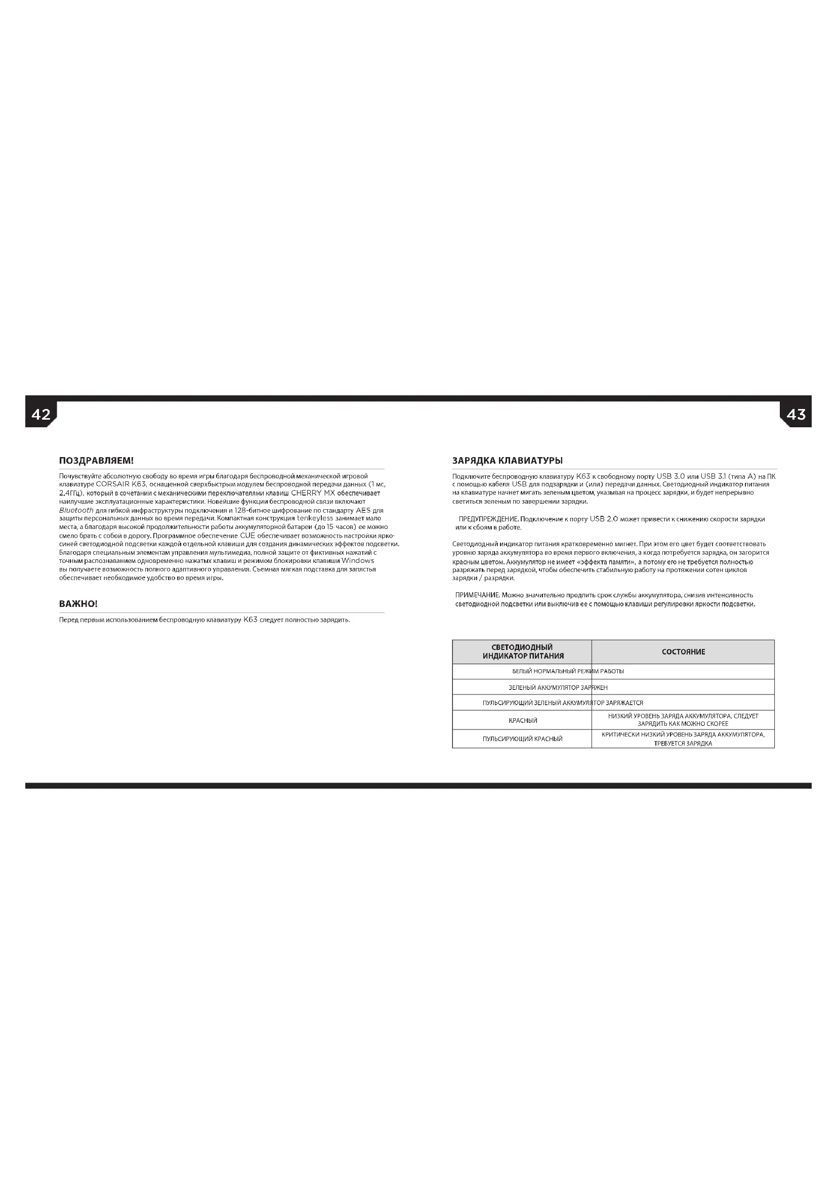 > Включите компьютер и беспроводную клавиатуру K63 > Подключите беспроводной USB-ресивер к свободному порту USB 2.0 или USB 3.0 компьютера и нажмите на клавиатуре комбинацию клавиш FN + F9 > После автоматического подключения светодиодный индикатор беспроводного соединения на клавиатуре будет непрерывно светиться белым ПРИМЕЧАНИЕ. Если подключение не будет установлено автоматически, включите режим сопряжения в программном обеспечении CUE и удерживайте нажатыми клавиши FN и F9 на клавиатуре до тех пор, пока светодиодный индикатор беспроводного соединения не начнет быстро мигать белый. Для наиболее эффективной работы в беспроводном режиме 2,4ГГц переместите беспроводной USB- приемник ближе к клавиатуре. Подключите его к порту USB на передней панели ПК или к кабелю USB для подзарядки или передачи данных через адаптер USB-кабеля. > Включите устройство с поддержкой Bluetooth 4.0 или более поздней версии, а также беспроводную клавиатуру K63 > Включите режим сопряжения по Bluetooth на устройстве > Удерживайте нажатыми клавиши FN + F10 на клавиатуре до тех пор, пока светодиодный индикатор беспроводного соединения не начнет быстро мигать синим > После подключения светодиодный индикатор беспроводного соединения на клавиатуре будет непрерывно светиться синим СВЕТОДИОДНЫЙ ИНДИКАТОР БЕСПРОВОДНОГО СОЕДИНЕНИЯ