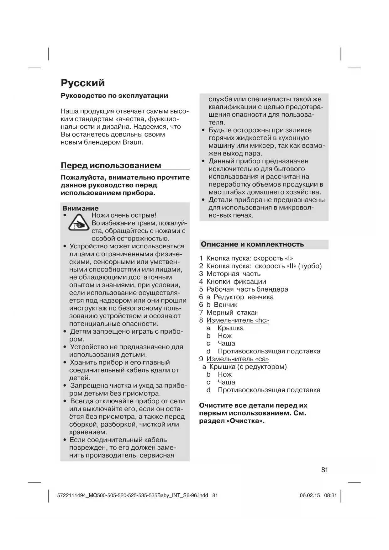 «Делонги» ААÿ, Ресей, 127055, Москва ìаласы, Сущёвская кÛшесі, 27/3-÷й (27-÷й, 3-ìÝрылым) Тел. +7 (495) 781-26-76 Ааулыты т±зету Ааулы Себебі Шешімі ÿол блендері жÝмыс істемей тÝр. ÿуат жоì ÿÝрылðыныÚ токìа ìосылðанын тексеріÚіз. йдегі саìтандырðышты/ìысìа тÝйыìтаðышты тексеріÚіз. Егер олардыÚ ешìайсысы аìаулы болмаса, Braun сервис орталыðына хабарласыÚыз. 5722111494_MQ500-505-520-525-535-535Baby_INT_S6-96.indd 805722111494_MQ500-505-520-525-535-535Baby_INT_S6-96.indd 80 06.02.15 08:3106.02.15 08:3181 Руководство по эксплуатации Наша продукция отвечает самым высо- ким стандартам качества, функцио- нальности и дизайна. Надеемся, что Вы останетесь довольны своим новым блендером Braun. Перед использованием Пожалуйста, внимательно прочтите данное руководство перед использованием прибора.