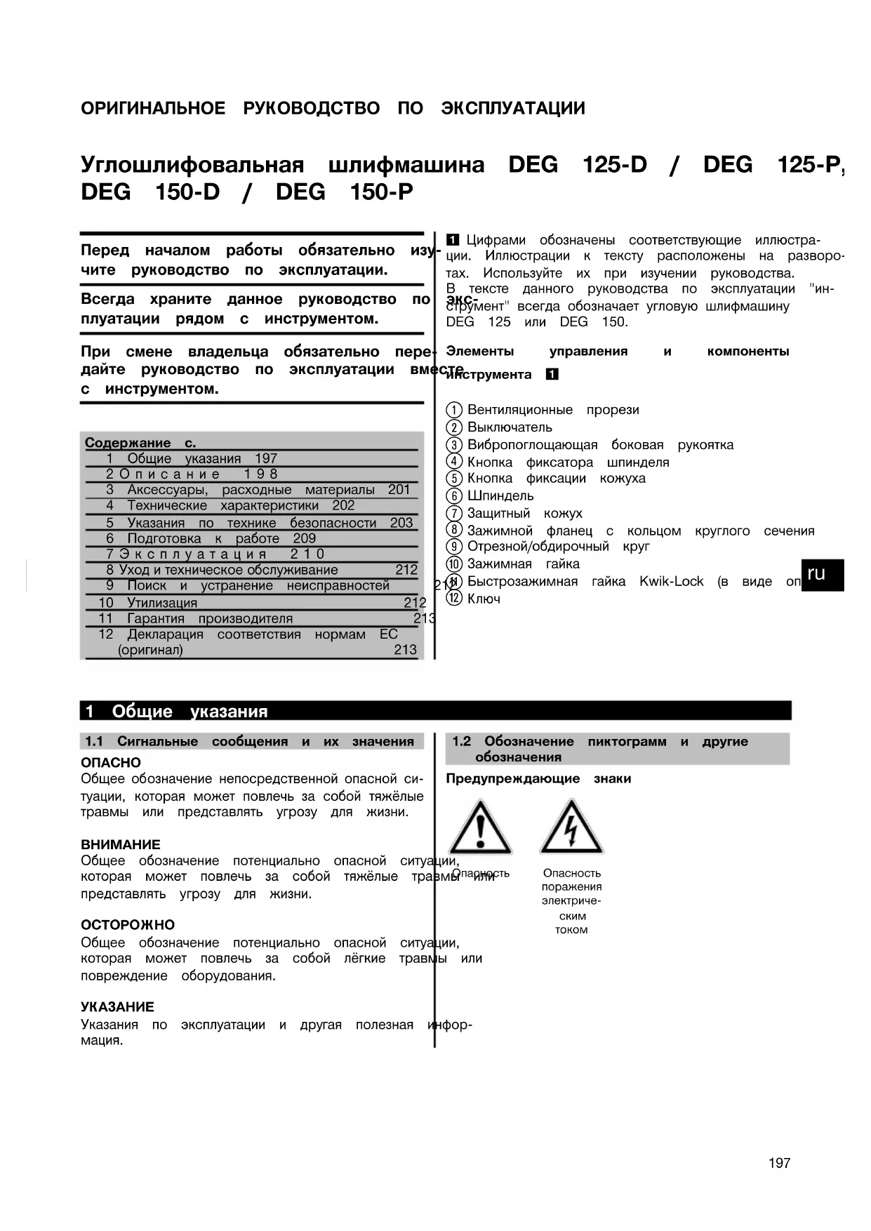 Перед началом работы обязательно изу- чите руководство по эксплуатации. Всегда храните данное руководство по экс- плуатации рядом с инструментом. При смене владельца обязательно пере- дайте руководство по эксплуатации вместе с инструментом. Содержание с.1 Общие указания 1972Описание 1983 Аксессуары, расходные материалы 2014 Технические характеристики 2025 Указания по технике безопасности 2036 Подготовка к работе 2097Эксплуатация 210 8Уходитехническоеобслуживание 212 9 Поиск и устранение неисправностей 21210 Утилизация 21211 Гарантия производителя 21312 Декларация соответствия нормам ЕС(оригинал) 2131 Цифрами обозначены соответствующие иллюстра-ции. Иллюстрации к тексту расположены на разворо-тах. Используйте их при изучении руководства.В тексте данного руководства по эксплуатации "ин- струмент" всегда обозначает угловую шлифмашину DEG 125 или DEG 150.Элементы управления и компонентыинструмента 1 Вентиляционные прорези Выключатель Вибропоглощающая боковая рукоятка Кнопка фиксатора шпинделя Кнопка фиксации кожуха