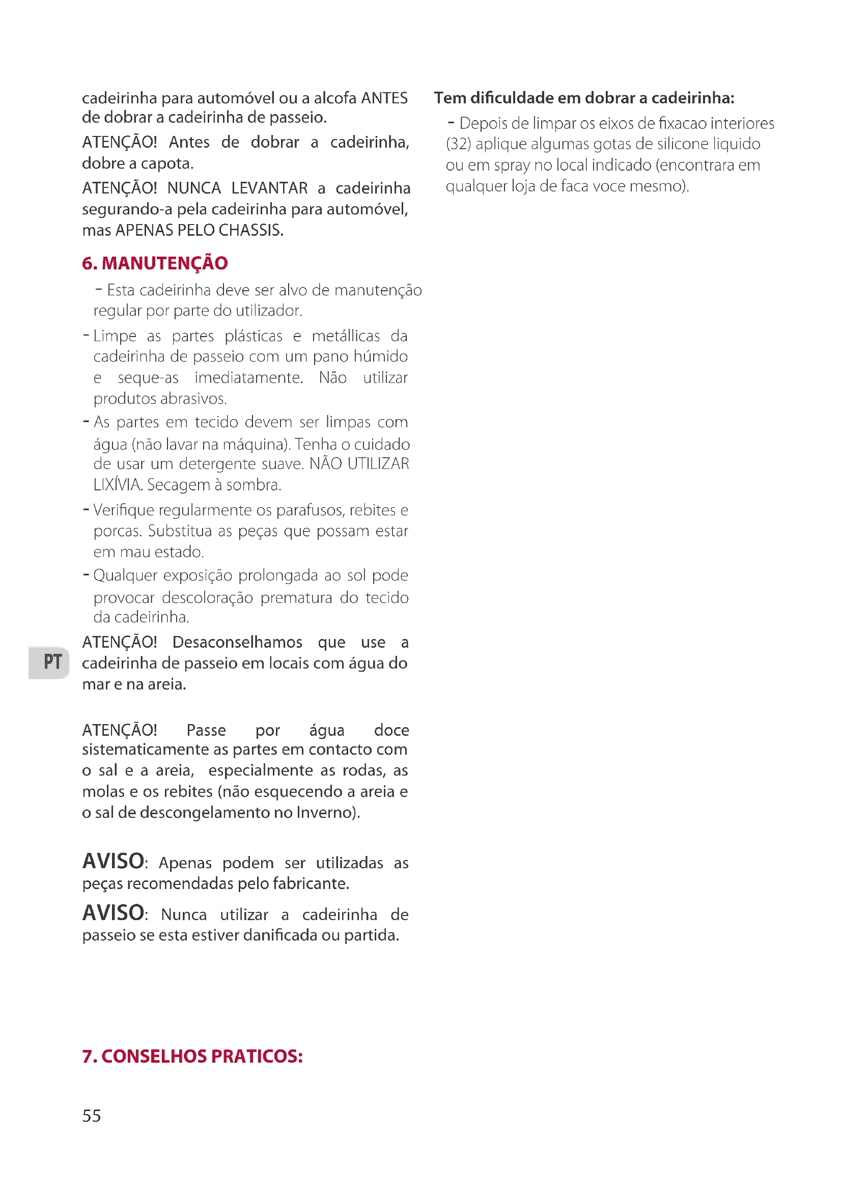 - Текстильные элементы следует промывать водой (машинная стирка запрещена). Используйте только нейтральные стиральные порошки. НЕ ИСПОЛЬЗУЙТЕ ОТБЕЛИВАТЕЛЬ. Сушите в тени. - Регулярно проверяйте состояние шурупов, заклепок и болтов. Заменяйте все изношенные детали. - Слишком долгое воздействие прямых солнечных лучей может привести к преждевременному выгоранию текстильных элементов коляски. ВНИМАНИЕ! Не рекомендуется использовать коляску для пляжных прогулок, поскольку возможно попадание в ее детали песка и морской воды. ВНИМАНИЕ! Всегда промывайте детали, соприкасавшиеся с солью и песком, в частности колеса, пружины и заклепки (в том числе после прогулок зимой по дорогам, посыпанным снегом или солью). ПРЕДУПРЕЖДЕНИЕ: используйте только детали, рекомендованные производителем. ПРЕДУПРЕЖДЕНИЕ: Никогда не используйте коляску при наличии повреждений или поломок.