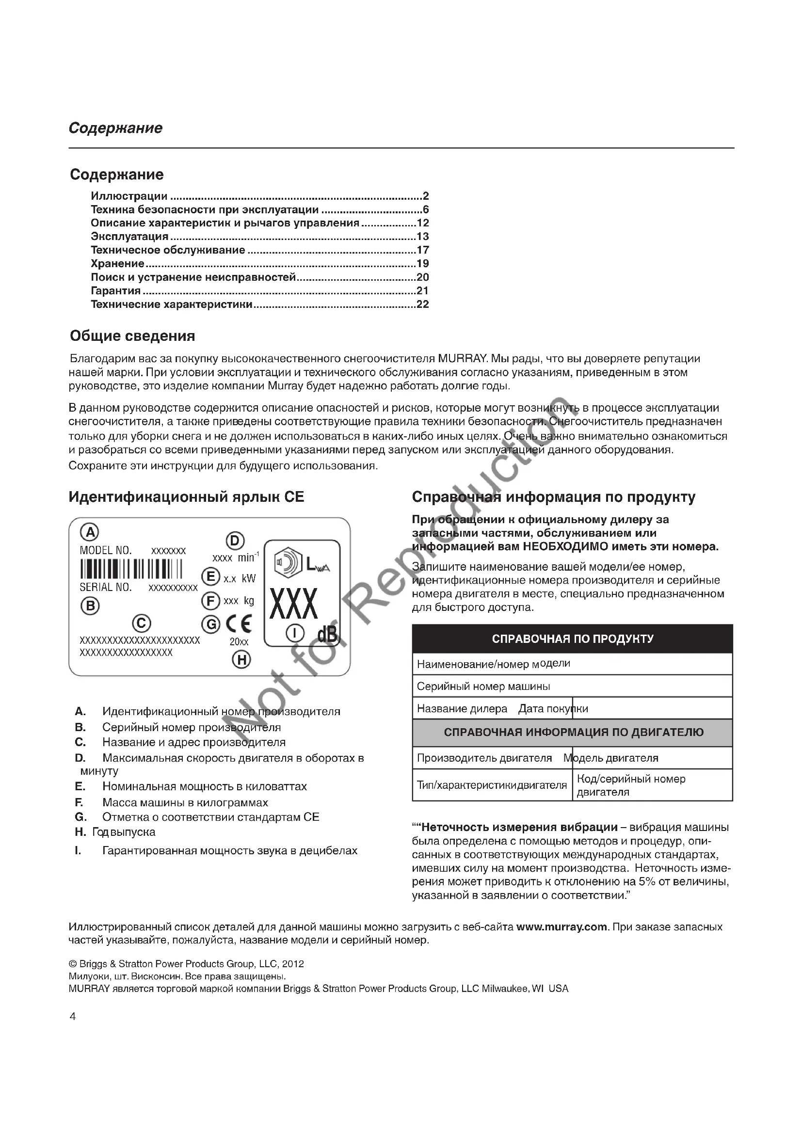 Справочная информация по продукту При обращении к официальному дилеру за запасными частями, обслуживанием или информацией вам НЕОБХОДИМО иметь эти номера. Запишите наименование вашей модели/ее номер, идентификационные номера производителя и серийные номера двигателя в месте, специально предназначенном для быстрого доступа. СПРАВОЧНАЯ ПО ПРОДУКТУНаименование/номер моделиСерийный номер машиныНазвание дилера Дата покупкиСПРАВОЧНАЯ ИНФОРМАЦИЯ ПО ДВИГАТЕЛЮПроизводитель двигателя Модель двигателя Тип /характеристики двигателя Код/серийный номер двигателя ““Неточность измерения вибрации – вибрация машины была определена с помощью методов и процедур, опи- санных в соответствующих международных стандартах, имевших силу на момент производства. Неточность изме- рения может приводить к отклонению на 5% от величины, указанной в заявлении о соответствии.” Иллюстрированный список деталей для данной машины можно загрузить с веб-сайта www.murray.com. При заказе запасных частей указывайте, пожалуйста, название модели и серийный номер. © Briggs & Stratton Power Products Group, LLC, 2012 Милуоки, шт. Висконсин. Все права защищены. MURRAY является торговой маркой компании Briggs & Stratton Power Products Group, LLC Milwaukee, WI USA