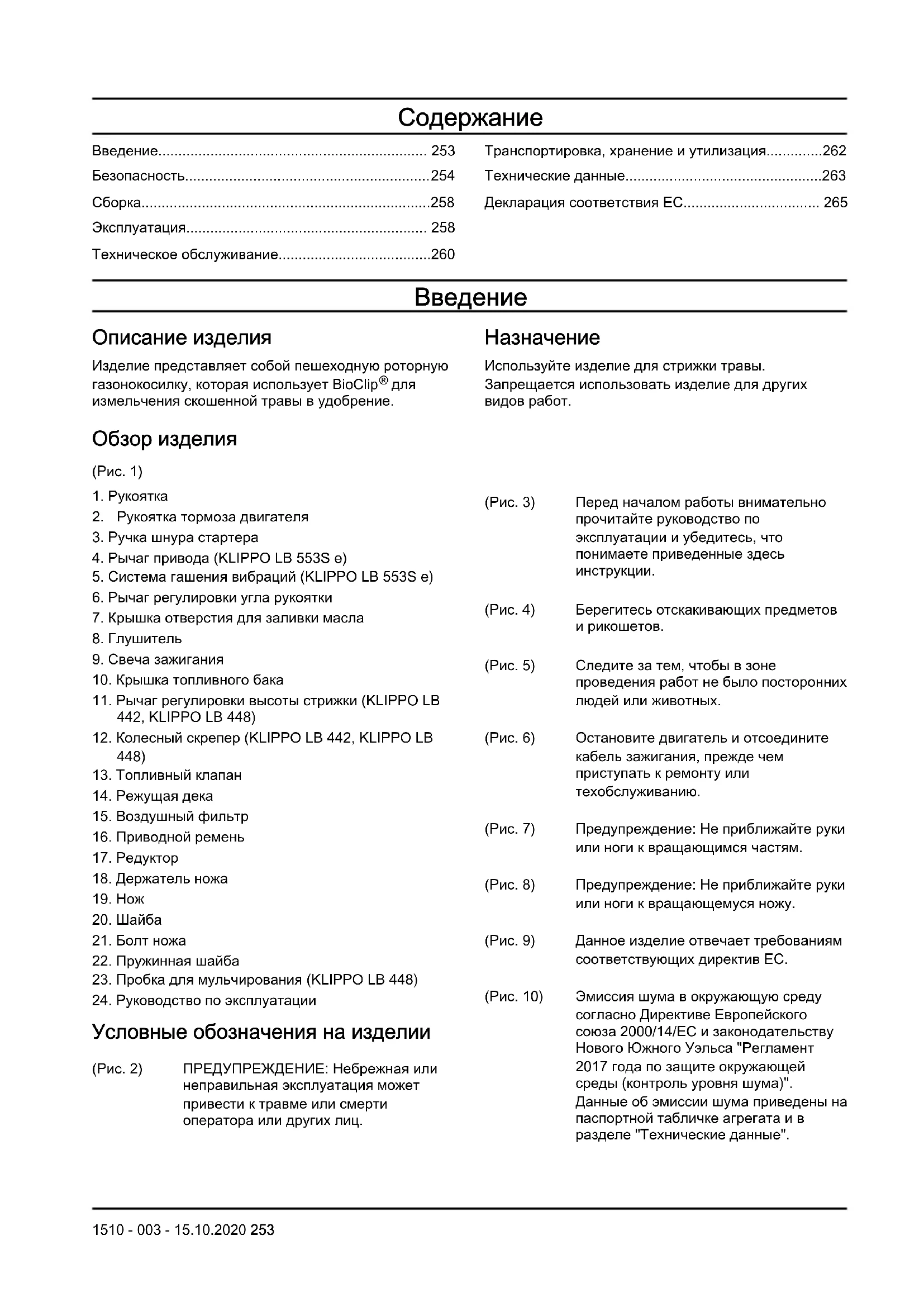 Условные обозначения на изделии (Pис. 2) ПРЕДУПРЕЖДЕНИЕ: Небрежная или неправильная эксплуатация может привести к травме или смерти оператора или других лиц. (Pис. 3) Перед началом работы внимательно прочитайте руководство по эксплуатации и убедитесь, что понимаете приведенные здесь инструкции. (Pис. 4) Берегитесь отскакивающих предметов и рикошетов. (Pис. 5) Следите за тем, чтобы в зоне проведения работ не было посторонних людей или животных. (Pис. 6) Остановите двигатель и отсоедините кабель зажигания, прежде чем приступать к ремонту или техобслуживанию. (Pис. 7) Предупреждение: Не приближайте руки или ноги к вращающимся частям. (Pис. 8) Предупреждение: Не приближайте руки или ноги к вращающемуся ножу. (Pис. 9) Данное изделие отвечает требованиям соответствующих директив ЕС. (Pис. 10) Эмиссия шума в окружающую среду согласно Директиве Европейского союза 2000/14/EC и законодательству Нового Южного Уэльса "Регламент 2017 года по защите окружающей среды (контроль уровня шума)". Данные об эмиссии шума приведены на паспортной табличке агрегата и в разделе "Технические данные". 1510 - 003 - 15.10.2020 253(Pис. 11) Сканируемый код. Примечание: Остальные символы/наклейки на изделии относятся к специальным требованиям сертификации в определенных коммерческих зонах. Соответствие уровня токсичных выбросов стандарту Euro V ПРЕДУПРЕЖДЕНИЕ: В случае вмешательства в работу двигателя данное изделие перестанет соответствовать нормативам ЕС. Ответственность изготовителя В соответствии с законами об ответственности изготовителя мы не несем ответственности за ущерб, вызванный эксплуатацией нашего изделия в результате: