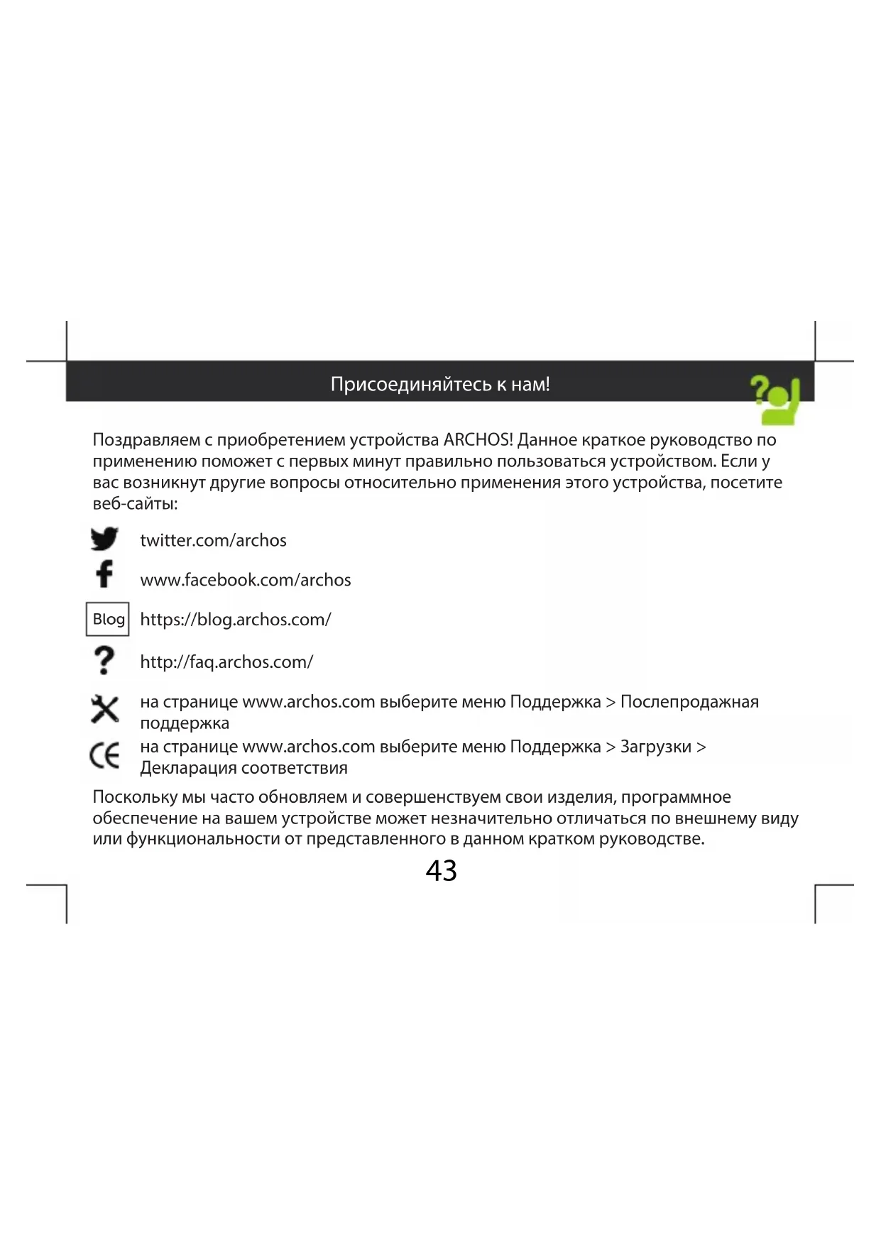 на странице www.archos.com выберите меню Поддержка > Загрузки > Декларация соответствия Поскольку мы часто обновляем и совершенствуем свои изделия, программное обеспечение на вашем устройстве может незначительно отличаться по внешнему виду или функциональности от представленного в данном кратком руководстве. Присоединяйтесь к нам!44 Warranty