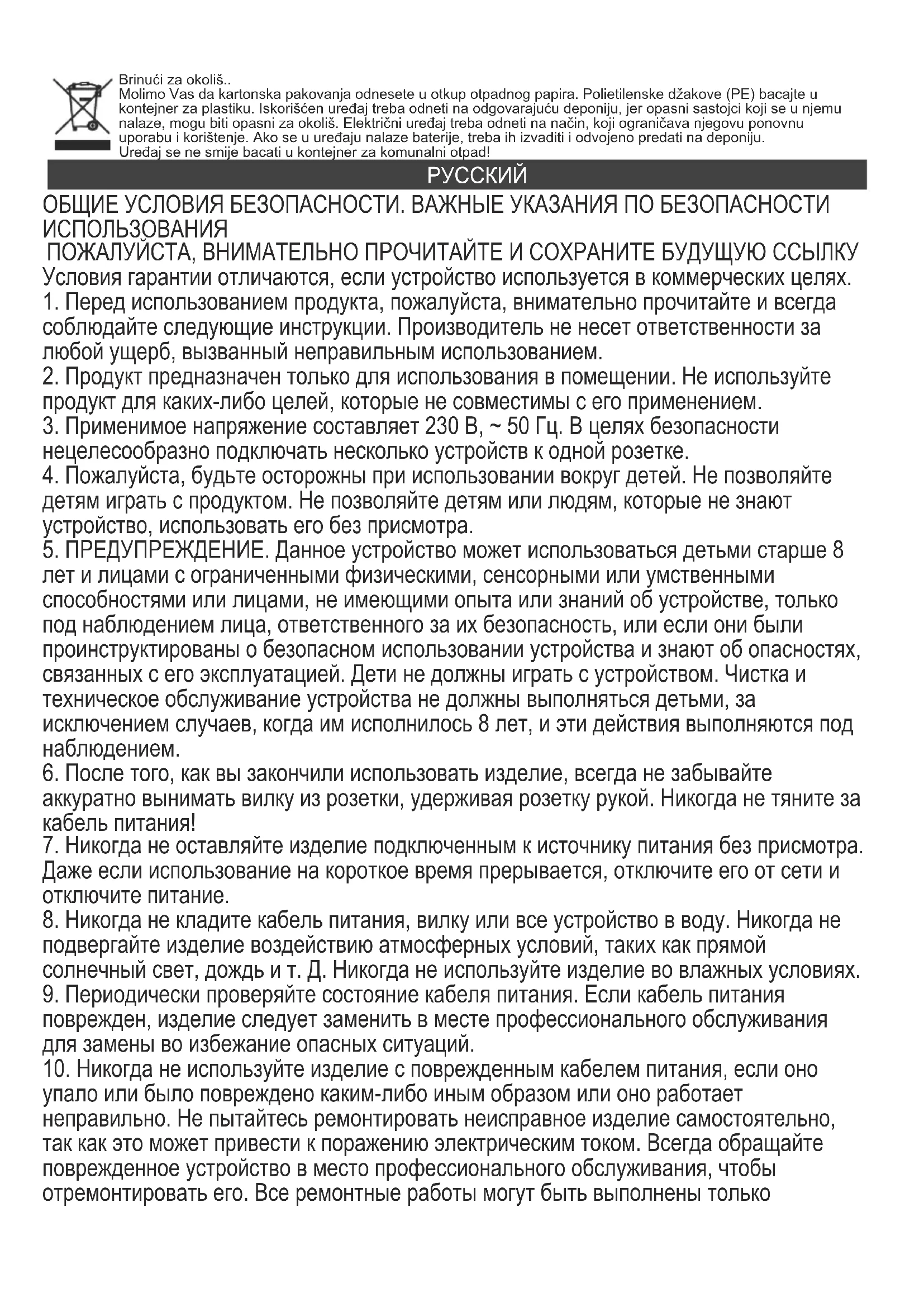 ОБЩИЕ УСЛОВИЯ БЕЗОПАСНОСТИ. ВАЖНЫЕ УКАЗАНИЯ ПО БЕЗОПАСНОСТИ ИСПОЛЬЗОВАНИЯ ПОЖАЛУЙСТА, ВНИМАТЕЛЬНО ПРОЧИТАЙТЕ И СОХРАНИТЕ БУДУЩУЮ ССЫЛКУ Условия гарантии отличаются, если устройство используется в коммерческих целях.