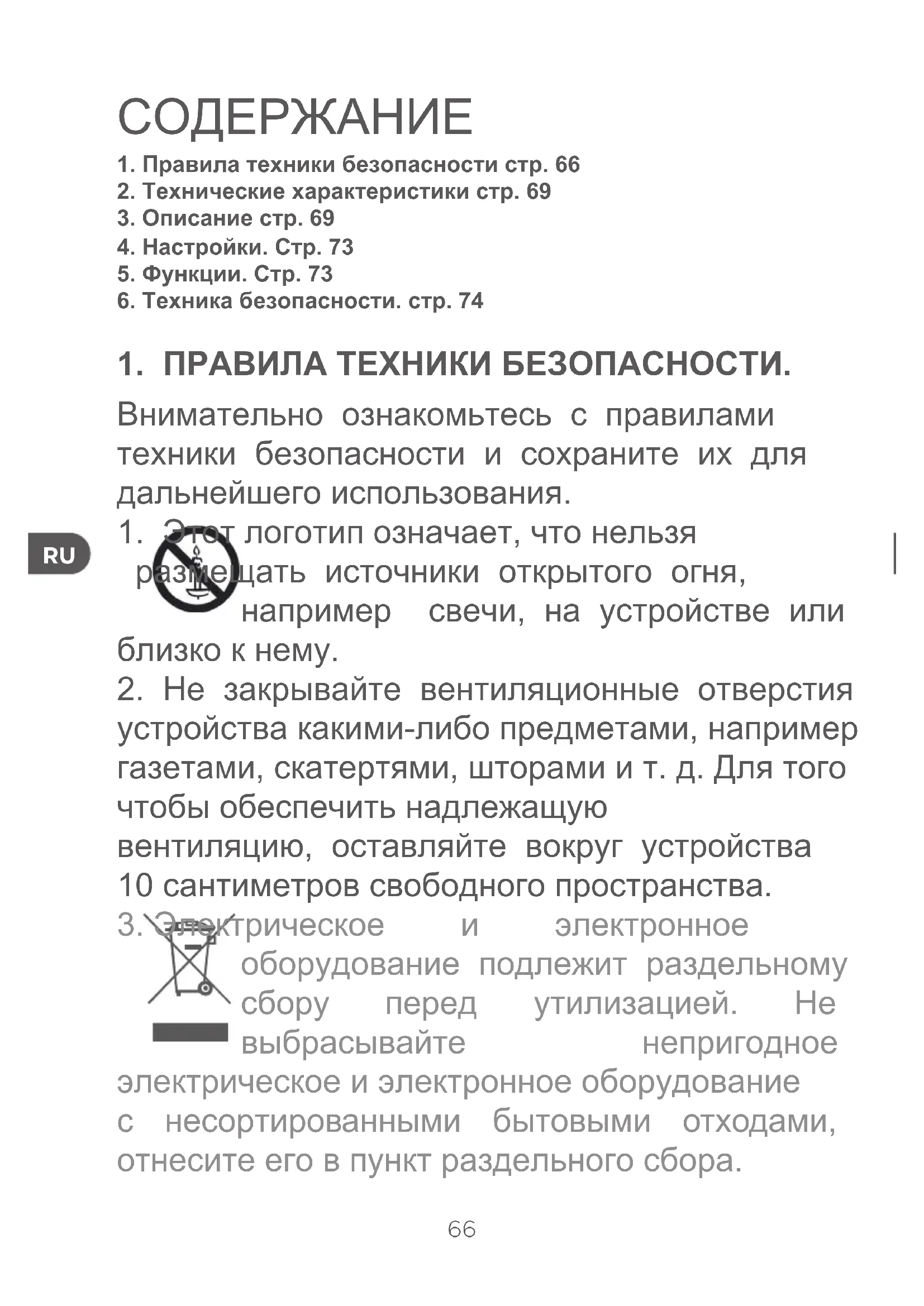 оборудование подлежит раздельному сбору перед утилизацией. Не выбрасывайте непригодное электрическое и электронное оборудование с несортированными бытовыми отходами, отнесите его в пункт раздельного сбора.67