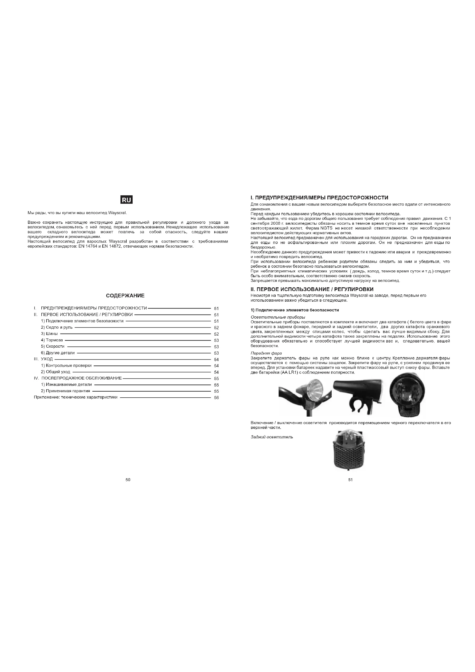 Приложение: технические характеристики Мы рады, что вы купили наш велосипед Wayscral. Важно сохранить настоящую инструкцию для правильной регулировки и должного ухода за велосипедом, ознакомьтесь с ней перед первым использованием. Ненадлежащее использование вашего складного велосипеда может повлечь за собой опасность, следуйте нашим предупреждениям и рекомендациям. Настоящий велосипед для взрослых Wayscral разработан в соответствии с требованиями европейских стандартов: EN 14764 и EN 14872, отвечающих нормам безопасности.