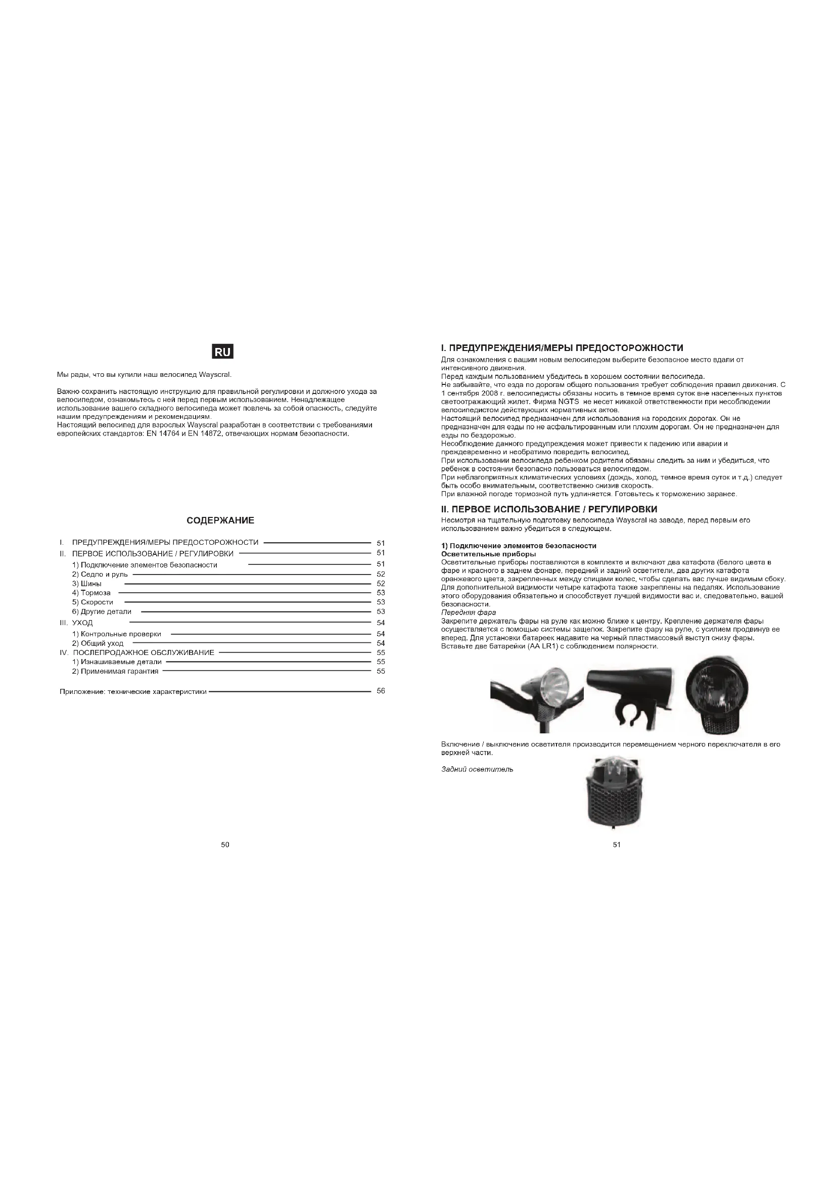 Приложение: технические характеристики Мы рады, что вы купили наш велосипед Wayscral. Важно сохранить настоящую инструкцию для правильной регулировки и должного ухода за велосипедом, ознакомьтесь с ней перед первым использованием. Ненадлежащее использование вашего складного велосипеда может повлечь за собой опасность, следуйте нашим предупреждениям и рекомендациям. Настоящий велосипед для взрослых Wayscral разработан в соответствии с требованиями европейских стандартов: EN 14764 и EN 14872, отвечающих нормам безопасности.