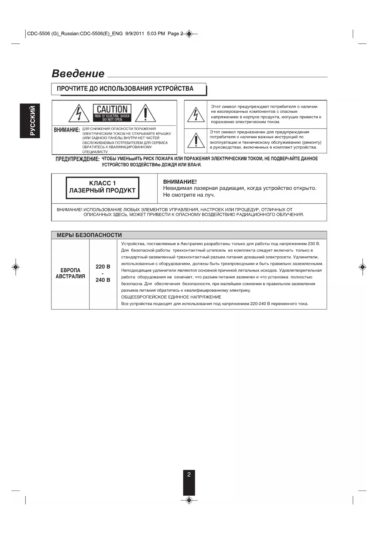 ПРЕДУПРЕЖДЕНИЕ: Устройства, поставляемые в Австралию разработаны только для работы под напряжением 230 В.Для безопасной работы трехконтактный штепсель из комплекта следует включать только встандартный заземленный трехконтактный разъем питания домашней электросети. Удлинители,использованные с оборудованием, должны быть трехпроводными и быть правильно заземленными.Неподходящие удлинители являются основной причиной летальных исходов. Удовлетворительнаяработа оборудования не означает, что разъем питания заземлен и что установка полностьюбезопасна. Для обеспечения безопасности, при малейшем сомнении в правильном заземленииразъема питания обратитесь к квалифицированному электрику.ОБЩЕЕВРОПЕЙСКОЕ ЕДИННОЕ НАПРЯЖЕНИЕВсе устройства подходят для использования под напряжением 220-240 В переменного тока. МЕРЫ БЕЗОПАСНОСТИ