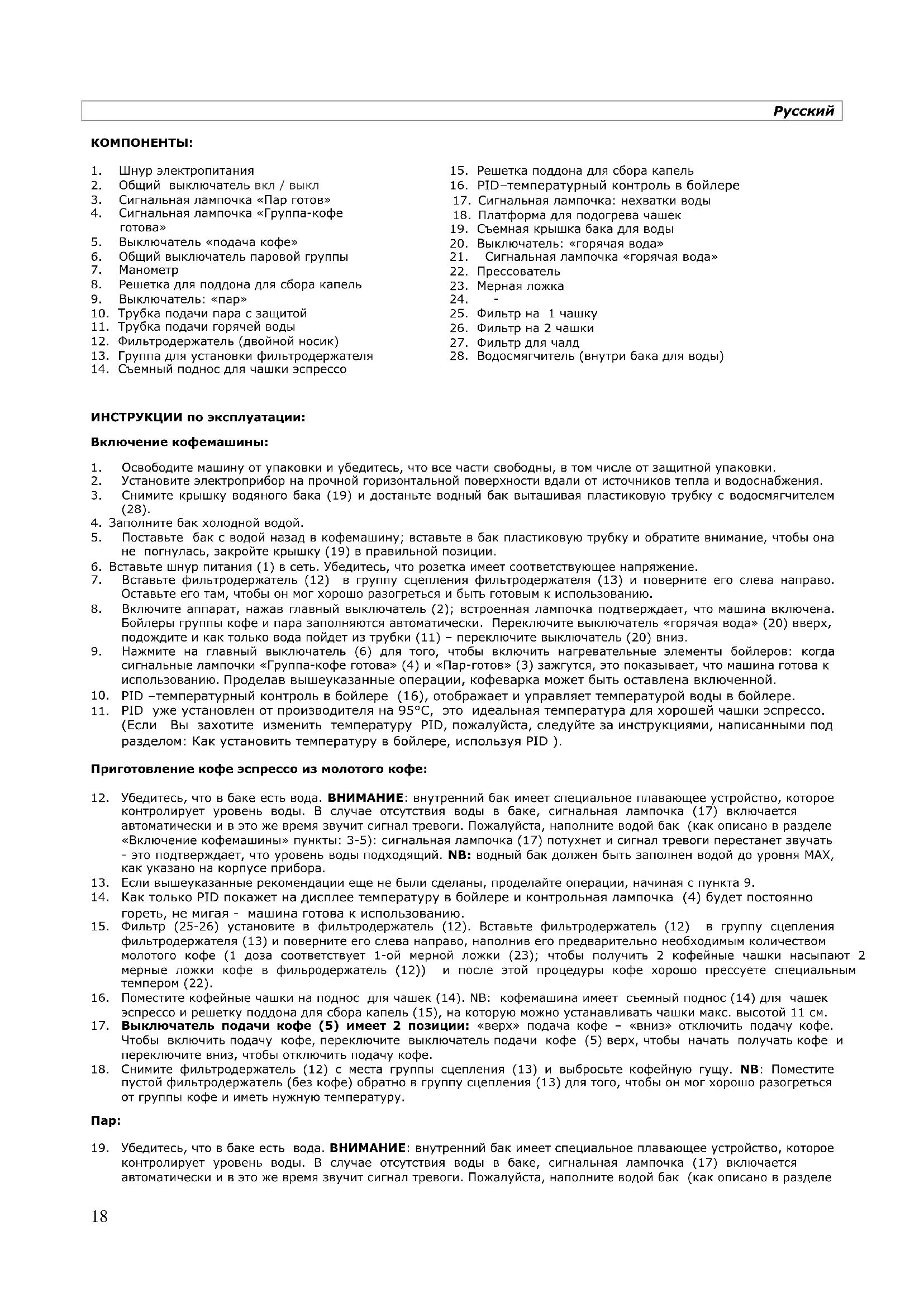 - Чтобы достигнуть высоких результатов, советуем предварительно подогревать чашки на специальной платформе (18), которая работает только когда электроприбор включен. - PID уже установлен производителем на правильной температуре для превосходного кофе эспрессо. Вовремя нагревания и производства кофе или выдачи воды, температура может колебаться (+/-10/12°C). Также, внесено предупреждение: после 108°C дисплей PID показывает температуру мигая периодически; это нормально, и это предупреждает пользователя, что кофе не будет хорош, если будет сделан с такой высокой температурой.