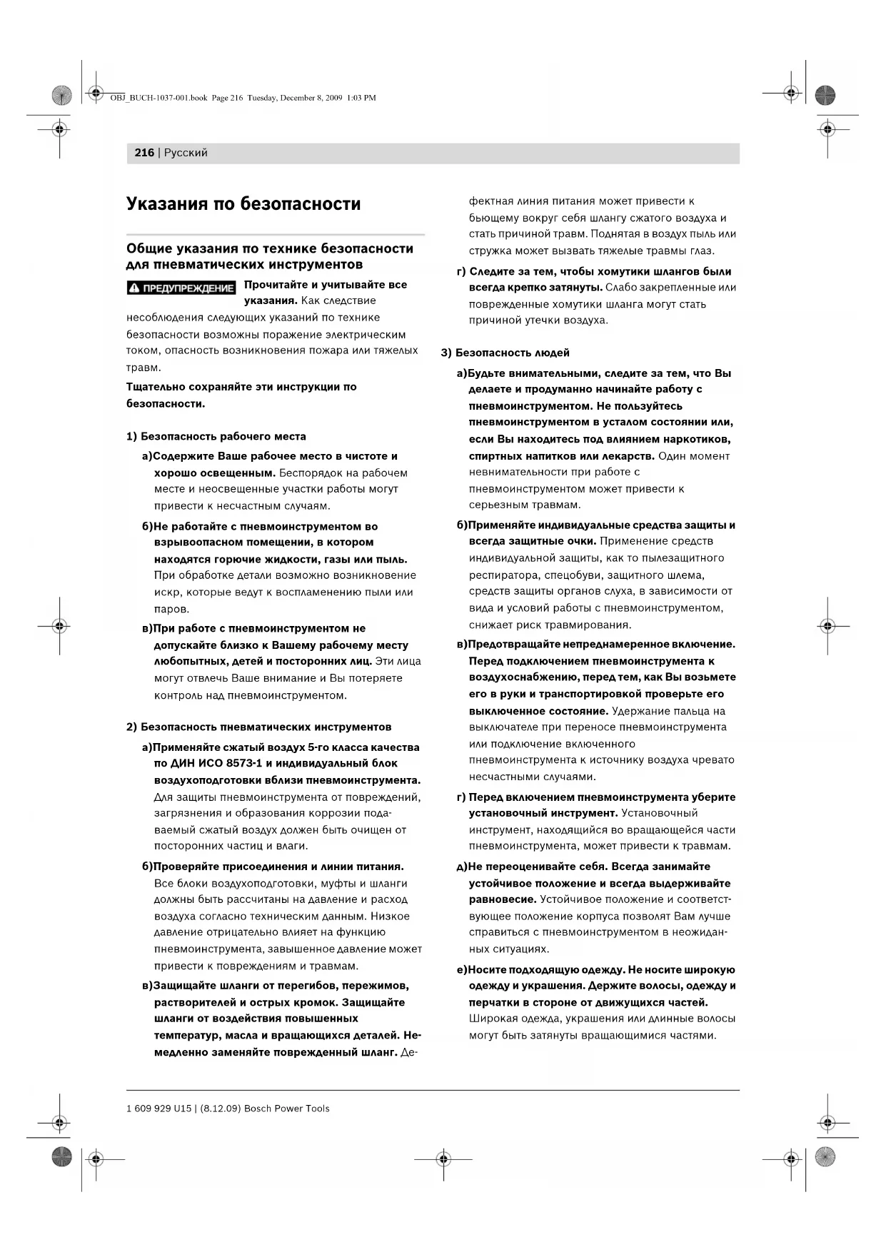 а)Будьте внимательными, следите за тем, что Вы делаете и продуманно начинайте работу с пневмоинструментом. Не пользуйтесь пневмоинструментом в усталом состоянии или, если Вы находитесь под влиянием наркотиков, спиртных напитков или лекарств. Один момент невнимательности при работе с пневмоинструментом может привести к серьезным травмам. б)Применяйте индивидуальные средства защиты и всегда защитные очки. Применение средств индивидуальной защиты, как то пылезащитного респиратора, спецобуви, защитного шлема, средств защиты органов слуха, в зависимости от вида и условий работы с пневмоинструментом, снижает риск травмирования. в)Предотвращайте непреднамеренное включение. Перед подключением пневмоинструмента к воздухоснабжению, перед тем, как Вы возьмете его в руки и транспортировкой проверьте его выключенное состояние. Удержание пальца на выключателе при переносе пневмоинструмента или подключение включенного пневмоинструмента к источнику воздуха чревато несчастными случаями. г) Перед включением пневмоинструмента уберите установочный инструмент. Установочный инструмент, находящийся во вращающейся части пневмоинструмента, может привести к травмам. д)Не переоценивайте себя. Всегда занимайте устойчивое положение и всегда выдерживайте равновесие. Устойчивое положение и соответст- вующее положение корпуса позволят Вам лучше справиться с пневмоинструментом в неожидан- ных ситуациях. е)Носите подходящую одежду. Не носите широкую одежду и украшения. Держите волосы, одежду и перчатки в стороне от движущихся частей. Широкая одежда, украшения или длинные волосы могут быть затянуты вращающимися частями. OBJ_BUCH-1037-001.book Page 216 Tuesday, December 8, 2009 1:03 PMРусский | 217 Bosch Power Tools 1 609 929 U15 | (8.12.09) ж)При наличии возможности установки пылеотсасывающих и пылесборных устройств проверяйте их присоединение и правильное использование. Использование этих устройств снижает опасность от воздействия пыли. з) Не вдыхайте отработанный воздух. Следите за тем, чтобы отработанный воздух не попадал в глаза. Отработанный воздух из пневмоинстру- мента может содержать воду, масло, металлические частицы и загрязнения, попадающие из компрессора. Это может иметь вредное влияние на здоровье.