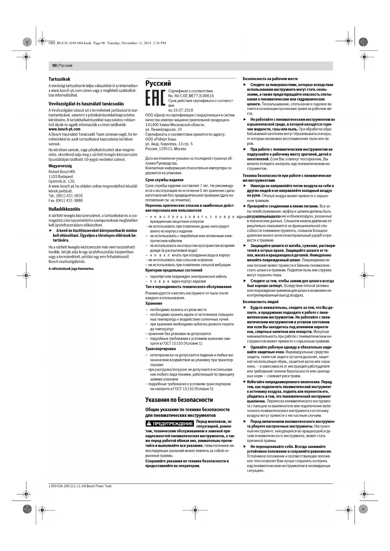 по 19.07.2018 ООО «Центр по сертификации стандартизации и систем качества электро-машиностроительной продукции» 141400 Химки Московской области, ул. Ленинградская, 29 Сертификаты о соответствии хранятся по адресу: ООО «Роберт Бош» ул. Акад. Королева, 13 стр. 5 Россия, 129515, Москва Дата изготовления указана на последней странице об- ложки Руководства. Контактная информация относительно импортера со- держится на упаковке. Срок службы изделия Срок службы изделия составляет 7 лет. Не рекоменду- ется к эксплуатации по истечении 5 лет хранения с даты изготовления без предварительной проверки (дату из- готовления см. на этикетке). Перечень критических отказов и ошибочные дейст- вия персонала или пользователя –не использовать с поврежденной рукояткой или по- врежденным защитным кожухом – не использовать при появлении дыма непосредст- венно из корпуса изделия – не использовать с перебитым или оголенным элек-