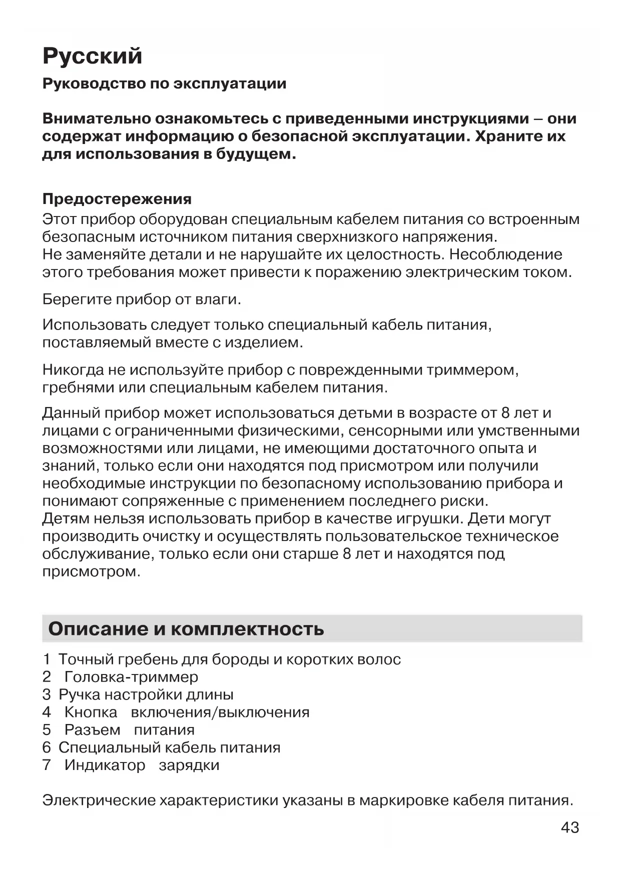 Руководство по эксплуатации Внимательно ознакомьтесь с приведенными инструкциями – они содержат информацию о безопасной эксплуатации. Храните их для использования в будущем. Предостережения Этот прибор оборудован специальным кабелем питания со встроенным безопасным источником питания сверхнизкого напряжения. Не заменяйте детали и не нарушайте их целостность. Несоблюдение этого требования может привести к поражению электрическим током. Берегите прибор от влаги. Использовать следует только специальный кабель питания, поставляемый вместе с изделием. Никогда не используйте прибор с поврежденными триммером, гребнями или специальным кабелем питания. Данный прибор может использоваться детьми в возрасте от 8 лет и лицами с ограниченными физическими, сенсорными или умственными возможностями или лицами, не имеющими достаточного опыта и знаний, только если они находятся под присмотром или получили необходимые инструкции по безопасному использованию прибора и понимают сопряженные с применением последнего риски. Детям нельзя использовать прибор в качестве игрушки. Дети могут производить очистку и осуществлять пользовательское техническое обслуживание, только если они старше 8 лет и находятся под присмотром. Описание и комплектность 1 Точный гребень для бороды и коротких волос 2 Головка-триммер 3 Ручка настройки длины 4 Кнопка включения/выключения 5 Разъем питания 6 Специальный кабель питания 7 Индикатор зарядки Электрические характеристики указаны в маркировке кабеля питания. 91320161_BT_3020_CEEMEA.indd 4391320161_BT_3020_CEEMEA.indd 43 04.01.17 14:0804.01.17 14:08 CSS APPROVED Effective Date 12Jan2017 GMT - Printed 05Apr2017 Page 43 of 6044