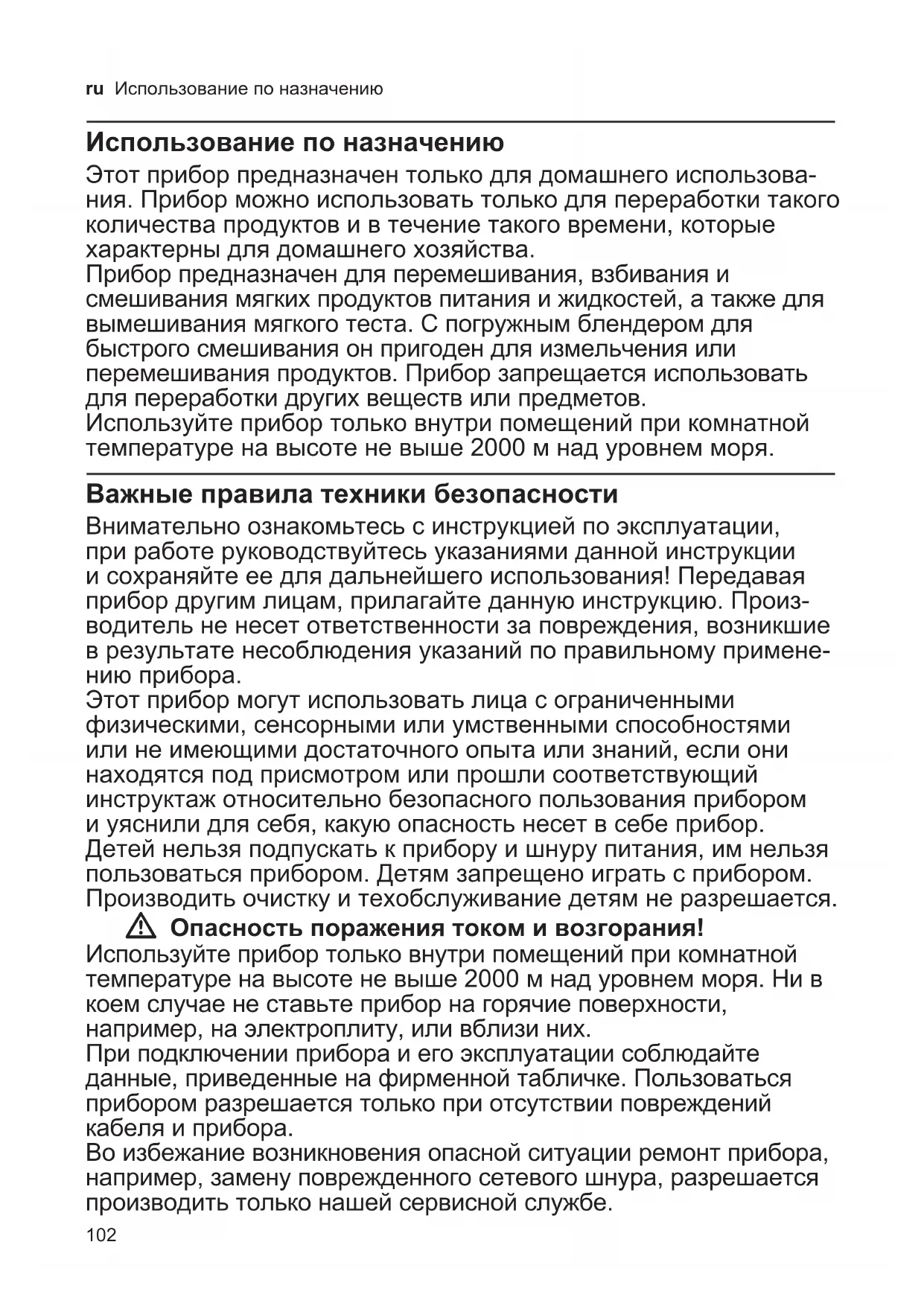 Цей прилад маркіровано згідно положень європейської Директиви 2012/19/EU стосовно електронних та електроприладів, що були у використанні (waste electrical and electronic equipment – WEEE). Директивою визначаються можли вості, які є дійсними у межах Європейського союзу, щодо прийняття назад та утилізації бувших у використанні приладів. Про актуальні можливості для видалення можна дізнатися в спеціалізованому магазині. Умови гарантії Стосовно цього приладу діють умови гарантії, щоб були опубліковані нашим компетентним представництвом в країні, в якій Ви придбали прилад. Ви можете в будьякий час одержати умови гарантії у спеціалізованому магазині, в якому Ви придбали прилад, або безпосередньо в нашому представництві у Вас в країні. Умови гарантії для Німеччини та адреси Ви знайдете на останніх чотирьох сторінках цієї брошури. Крім того, умови гарантії розміщені також і в Інтернеті за зазначеною адресою. Для користування гарантійними послугами необхідно в будьякому випадку показати квитанцію про оплату. Можливі зміни.102 ru Использование по назначению Использование по назначению Этот прибор предназначен только для домашнего использова ния. Прибор можно использовать только для переработки такого количества продуктов и в течение такого времени, которые характерны для домашнего хозяйства. Прибор предназначен для перемешивания, взбивания и смешивания мягких продуктов питания и жидкостей, а также для вымешивания мягкого теста. С погружным блендером для быстрого смешивания он пригоден для измельчения или перемешивания продуктов. Прибор запрещается использовать для переработки других веществ или предметов. Используйте прибор только внутри помещений при комнатной температуре на высоте не выше 2000 м над уровнем моря. Важные правила техники безопасности Внимательно ознакомьтесь с инструкцией по эксплуатации, при работе руководствуйтесь указаниями данной инструкции и сохраняйте ее для дальнейшего использования! Передавая прибор другим лицам, прилагайте данную инструкцию. Произ водитель не несет ответственности за повреждения, возникшие в результате несоблюдения указаний по правильному примене нию прибора. Этот прибор могут использовать лица с ограниченными физическими, сенсорными или умственными способностями или не имеющими достаточного опыта или знаний, если они находятся под присмотром или прошли соответствующий инструктаж относительно безопасного пользования прибором и уяснили для себя, какую опасность несет в себе прибор. Детей нельзя подпускать к прибору и шнуру питания, им нельзя пользоваться прибором. Детям запрещено играть с прибором. Производить очистку и техобслуживание детям не разрешается. W Опасность поражения током и возгорания! Используйте прибор только внутри помещений при комнатной температуре на высоте не выше 2000 м над уровнем моря. Ни в коем случае не ставьте прибор на горячие поверхности, например, на электроплиту, или вблизи них. При подключении прибора и его эксплуатации соблюдайте данные, приведенные на фирменной табличке. Пользоваться прибором разрешается только при отсутствии повреждений кабеля и прибора. Во избежание возникновения опасной ситуации ремонт прибора, например, замену поврежденного сетевого шнура, разрешается производить только нашей сервисной службе.103