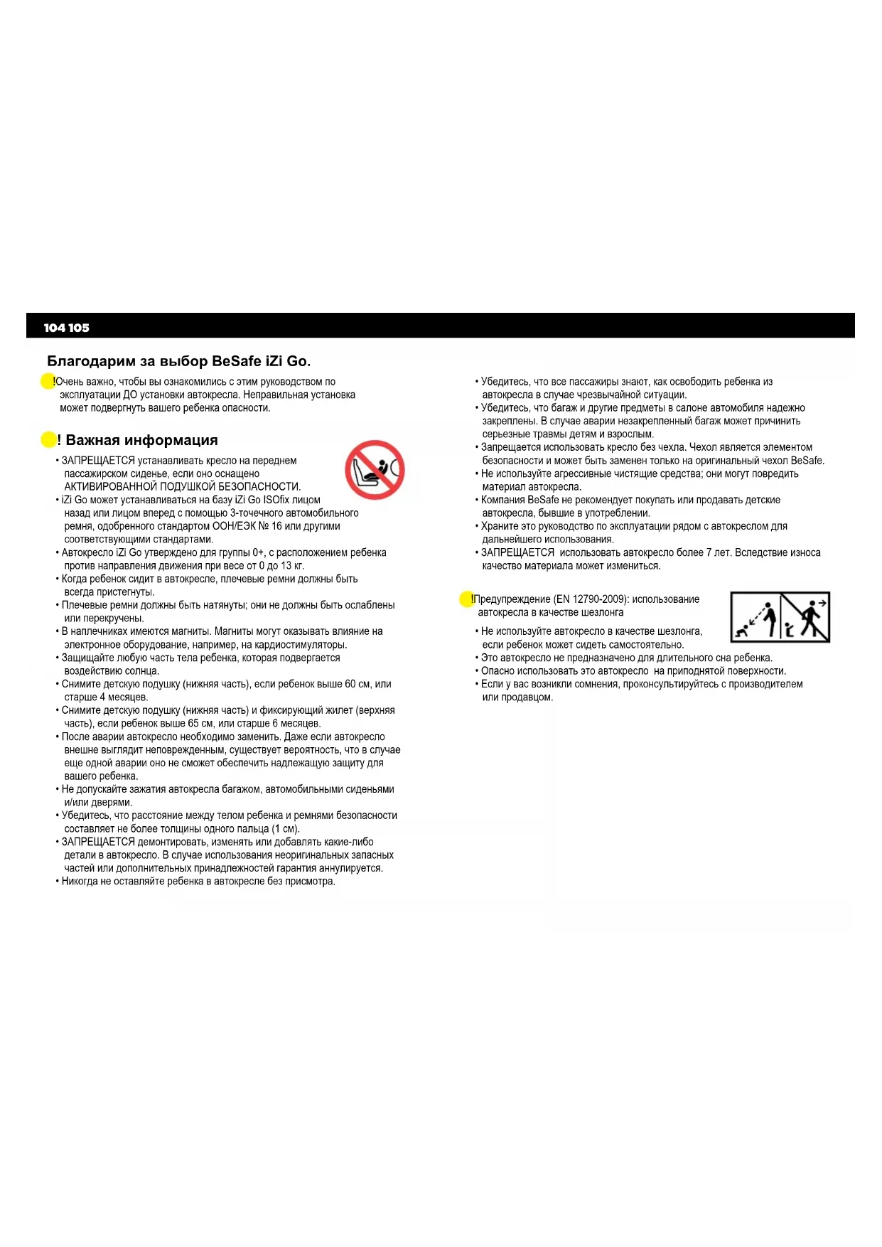- Никогданеоставляйтеребенкававтокреслебезприсмотра. Благодарим за выбор BeSafe iZi Go. ! Оченьважно,чтобывыознакомилисьсэтимруководствомпо эксплуатацииДОустановкиавтокресла.Неправильнаяустановка можетподвергнутьвашегоребенкаопасности. ! Предупреждение(EN12790-2009):использование автокреславкачествешезлонга