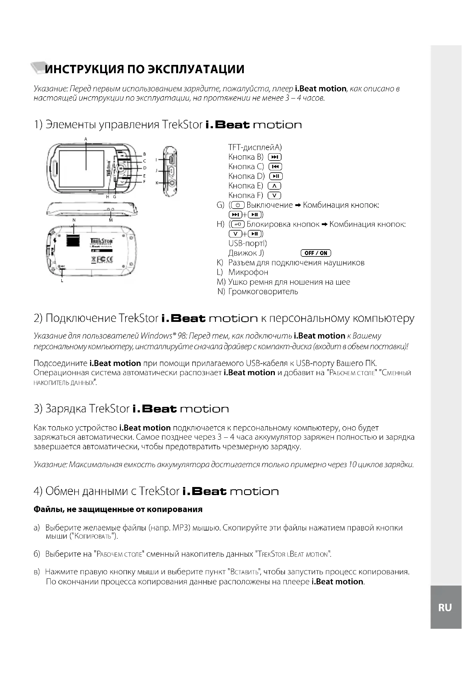 ИНСТРУКЦИЯ ПО ЭКСПЛУАТАЦИИ Указание: Перед первым использованием зарядите, пожалуйста, плеер i.Beat motion, как описано в настоящей инструкции по эксплуатации, на протяжении не менее 3 – 4 часов.