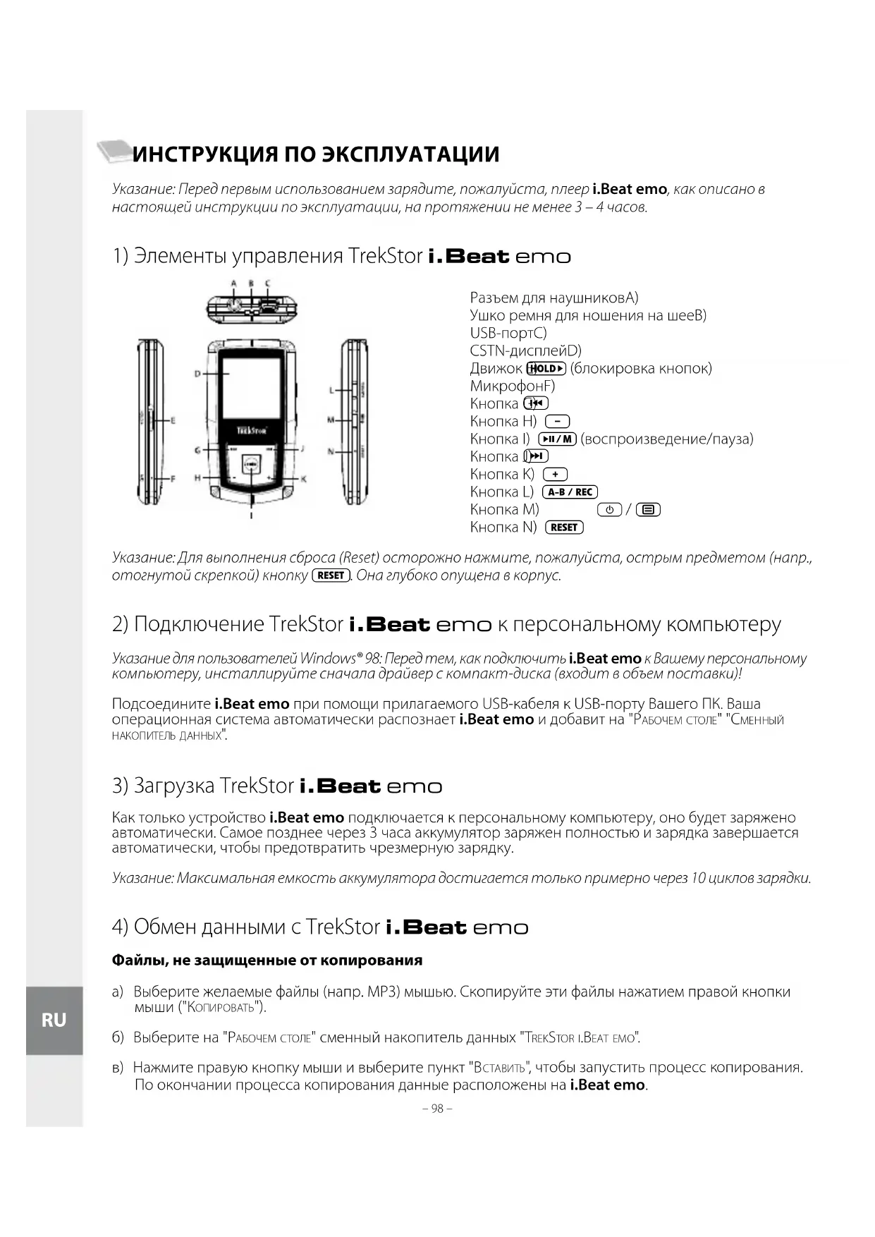 – 99 – ИНСТРУКЦИЯ ПО ЭКСПЛУАТАЦИИ Указание: Перед первым использованием зарядите, пожалуйста, плеер i.Beat emo, как описано в настоящей инструкции по эксплуатации, на протяжении не менее 3 – 4 часов.