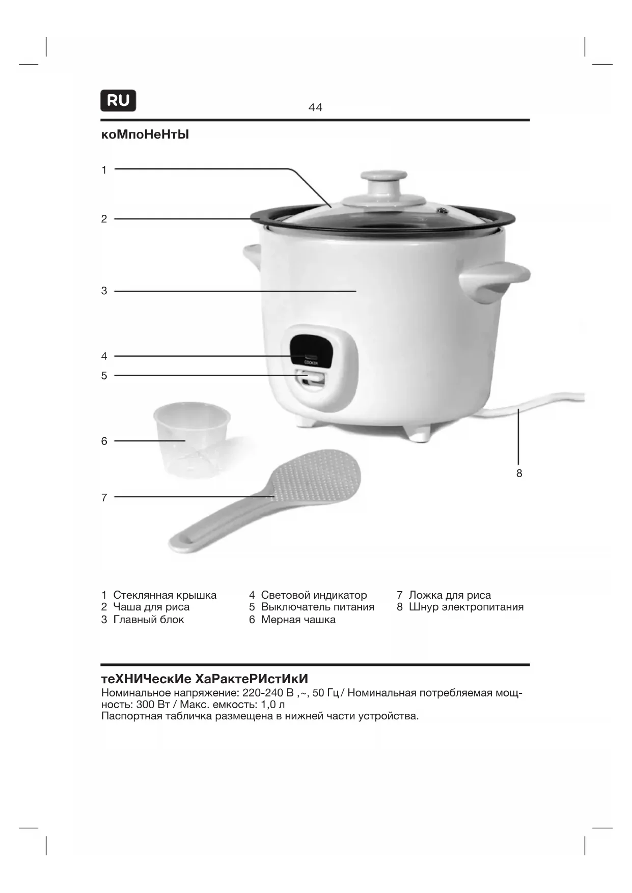 Номинальное напряжение: 220-240 В , ~, 50 Гц / Номинальная потребляемая мощ- ность: 300 Вт / Макс. емкость: 1,0 л Паспортная табличка размещена в нижней части устройства. теХНИЧескИе ХаРактеРИстИкИ 1 Стеклянная крышка 2 Чаша для риса 3 Главный блок 4 Световой индикатор 5 Выключатель питания 6 Мерная чашка 7 Ложка для риса 8 Шнур электропитания