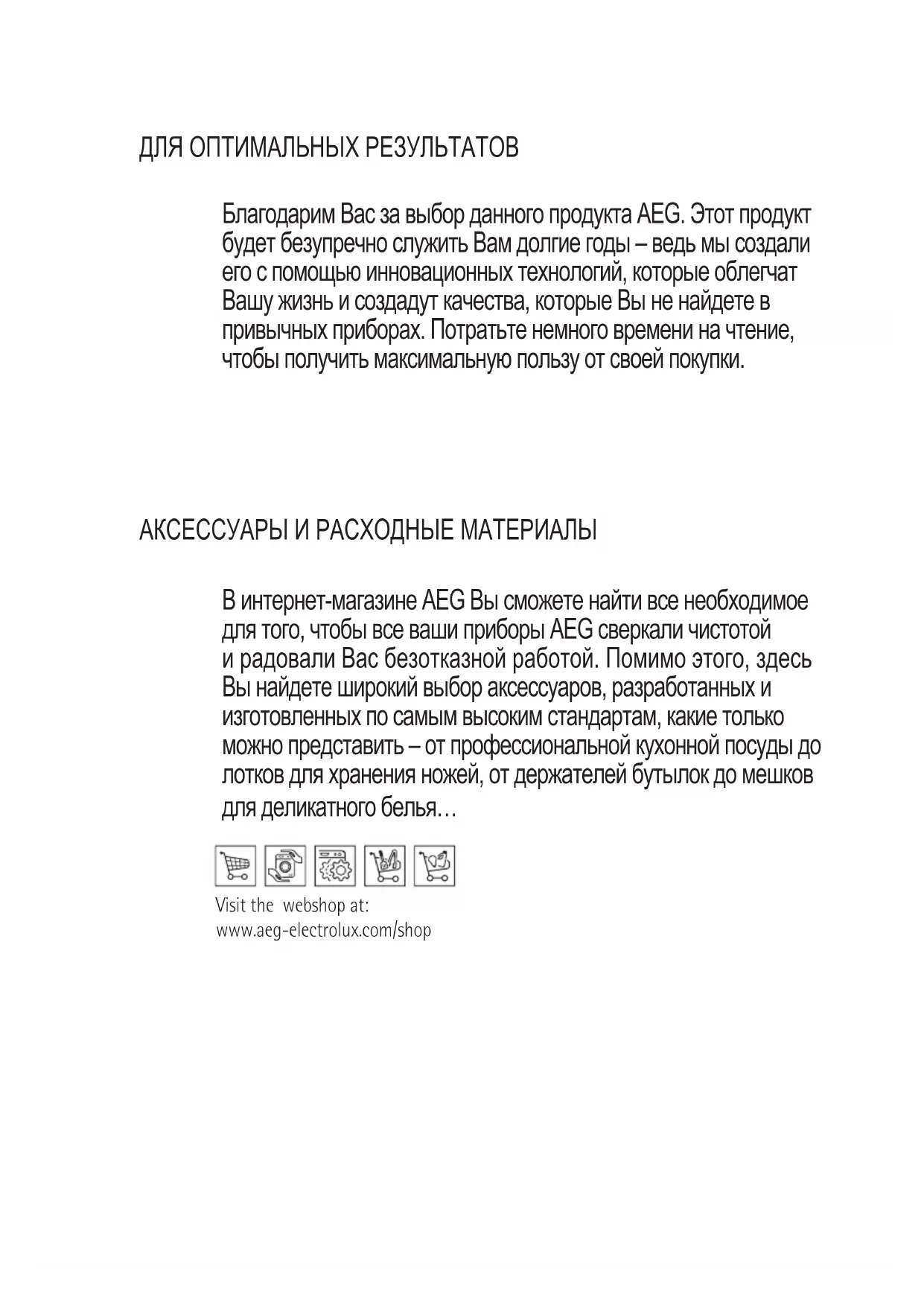 34ДЛЯ ОПТИМАЛЬНЫХ РЕЗУЛЬТАТОВ Благодарим Вас за выбор данного продукта AEG. Этот продукт будет безупречно служить Вам долгие годы – ведь мы создали его с помощью инновационных технологий, которые облегчат Вашу жизнь и создадут качества, которые Вы не найдете в привычных приборах. Потратьте немного времени на чтение, чтобы получить максимальную пользу от своей покупки. АКСЕССУАРЫ И РАСХОДНЫЕ МАТЕРИАЛЫ В интернет-магазине AEG Вы сможете найти все необходимое для того, чтобы все ваши приборы AEG сверкали чистотой и радовали Вас безотказной работой. Помимо этого, здесь Вы найдете широкий выбор аксессуаров, разработанных и изготовленных по самым высоким стандартам, какие только можно представить – от профессиональной кухонной посуды до лотков для хранения ножей, от держателей бутылок до мешков для деликатного белья… Visit the webshop at: www.aeg-electrolux.com/shopRU - СОВЕТЫ И РЕКОМЕНДАЦИИ