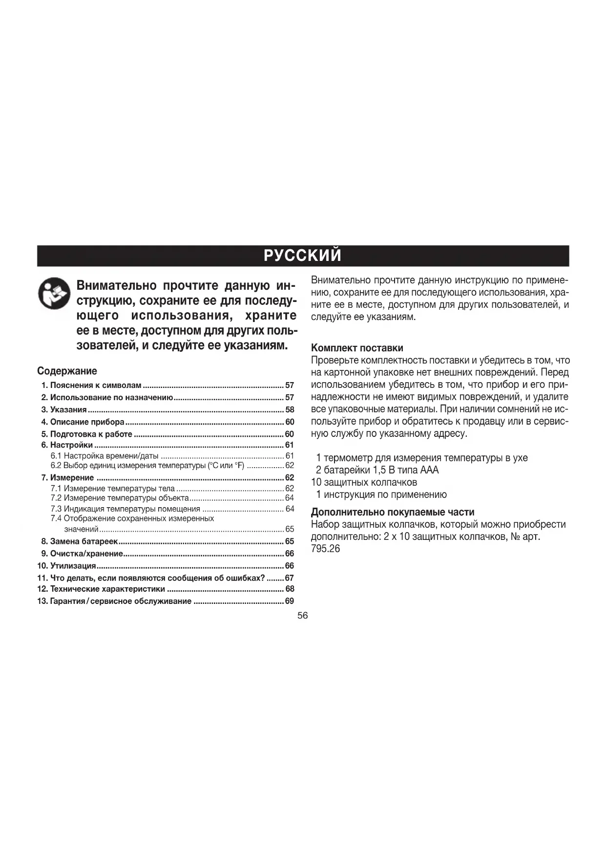 Внимательно прочтите данную ин- струкцию, сохраните ее для последу- ющего использования, храните еевместе, доступном для других поль- зователей, иследуйте ее указаниям. Внимательно прочтите данную инструкцию по примене- нию, сохраните ее для последующего использования, хра- ните ее в месте, доступном для других пользователей, и следуйте ее указаниям. Комплект поставки Проверьте комплектность поставки иубедитесь втом, что накартонной упаковке нет внешних повреждений. Перед использованием убедитесь втом, что прибор иего при- надлежности неимеют видимых повреждений, иудалите все упаковочные материалы. При наличии сомнений неис- пользуйте прибор иобратитесь кпродавцу или всервис- ную службу поуказанному адресу. 1 термометр для измерения температуры вухе 2батарейки 1,5В типаAAA 10 защитных колпачков 1 инструкция поприменению Дополнительно покупаемые части Набор защитных колпачков, который можно приобрести дополнительно: 2 x 10 защитных колпачков, № арт.