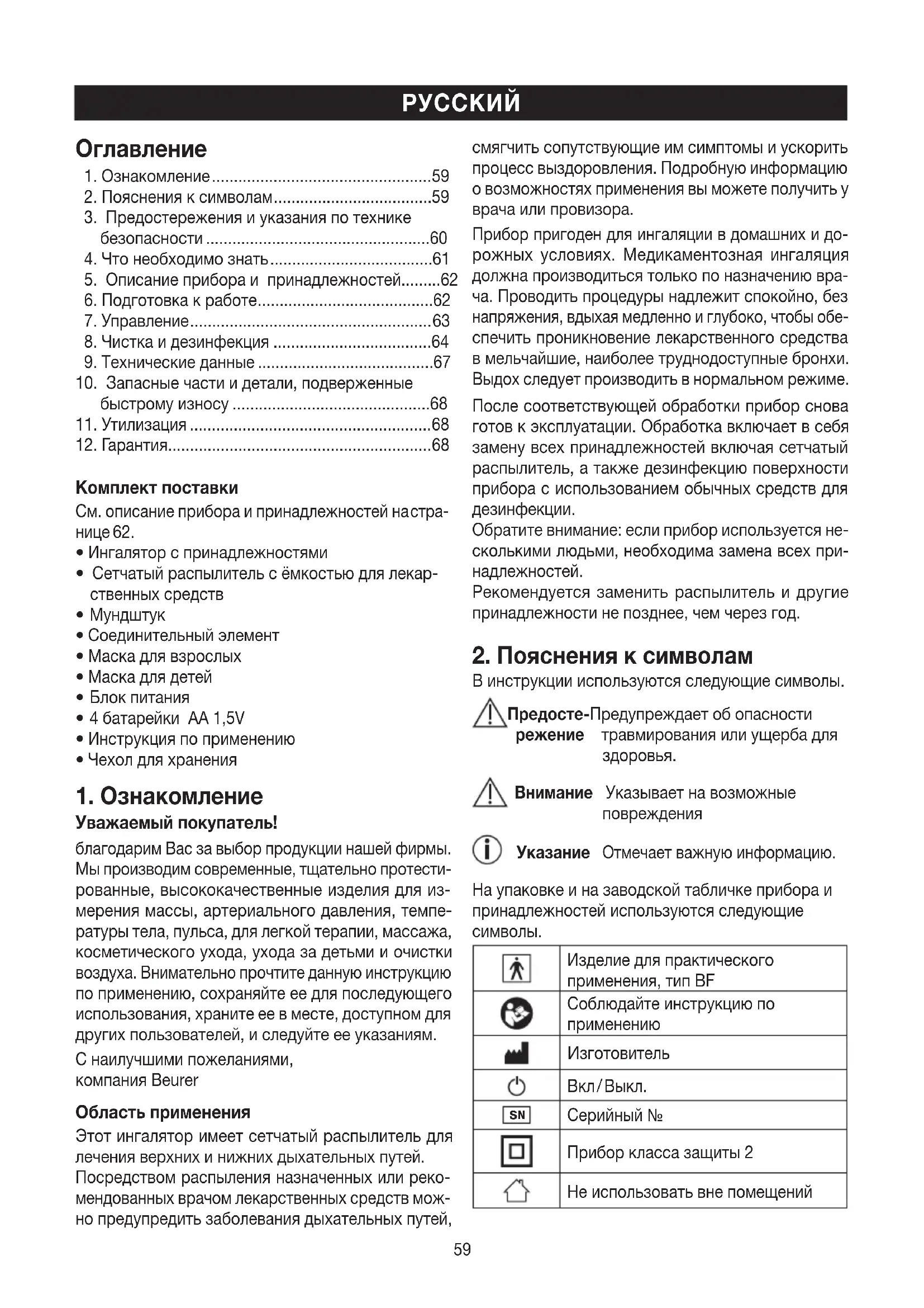Уважаемый покупатель! благодарим Вас за выбор продукции нашей фирмы. Мы производим современные, тщательно протести- рованные, высококачественные изделия для из- мерения массы, артериального давления, темпе- ратуры тела, пульса, для легкой терапии, массажа, косметического ухода, ухода за детьми и очистки воздуха. Внимательно прочтите данную инструкцию по применению, сохраняйте ее для последующего использования, храните ее в месте, доступном для других пользователей, и следуйте ее указаниям. С наилучшими пожеланиями, компания Beurer Область применения Этот ингалятор имеет сетчатый распылитель для лечения верхних и нижних дыхательных путей. Посредством распыления назначенных или реко- мендованных врачом лекарственных средств мож- но предупредить заболевания дыхательных путей, смягчить сопутствующие им симптомы и ускорить процесс выздоровления. Подробную информацию о возможностях применения вы можете получить у врача или провизора. Прибор пригоден для ингаляции в домашних и до- рожных условиях. Медикаментозная ингаляция должна производиться только по назначению вра- ча. Проводить процедуры надлежит спокойно, без напряжения, вдыхая медленно и глубоко, чтобы обе- спечить проникновение лекарственного средства в мельчайшие, наиболее труднодоступные бронхи. Выдох следует производить в нормальном режиме. После соответствующей обработки прибор снова готов к эксплуатации. Обработка включает в себя замену всех принадлежностей включая сетчатый распылитель, а также дезинфекцию поверхности прибора с использованием обычных средств для дезинфекции. Обратите внимание: если прибор используется не- сколькими людьми, необходима замена всех при- надлежностей. Рекомендуется заменить распылитель и другие принадлежности не позднее, чем через год.