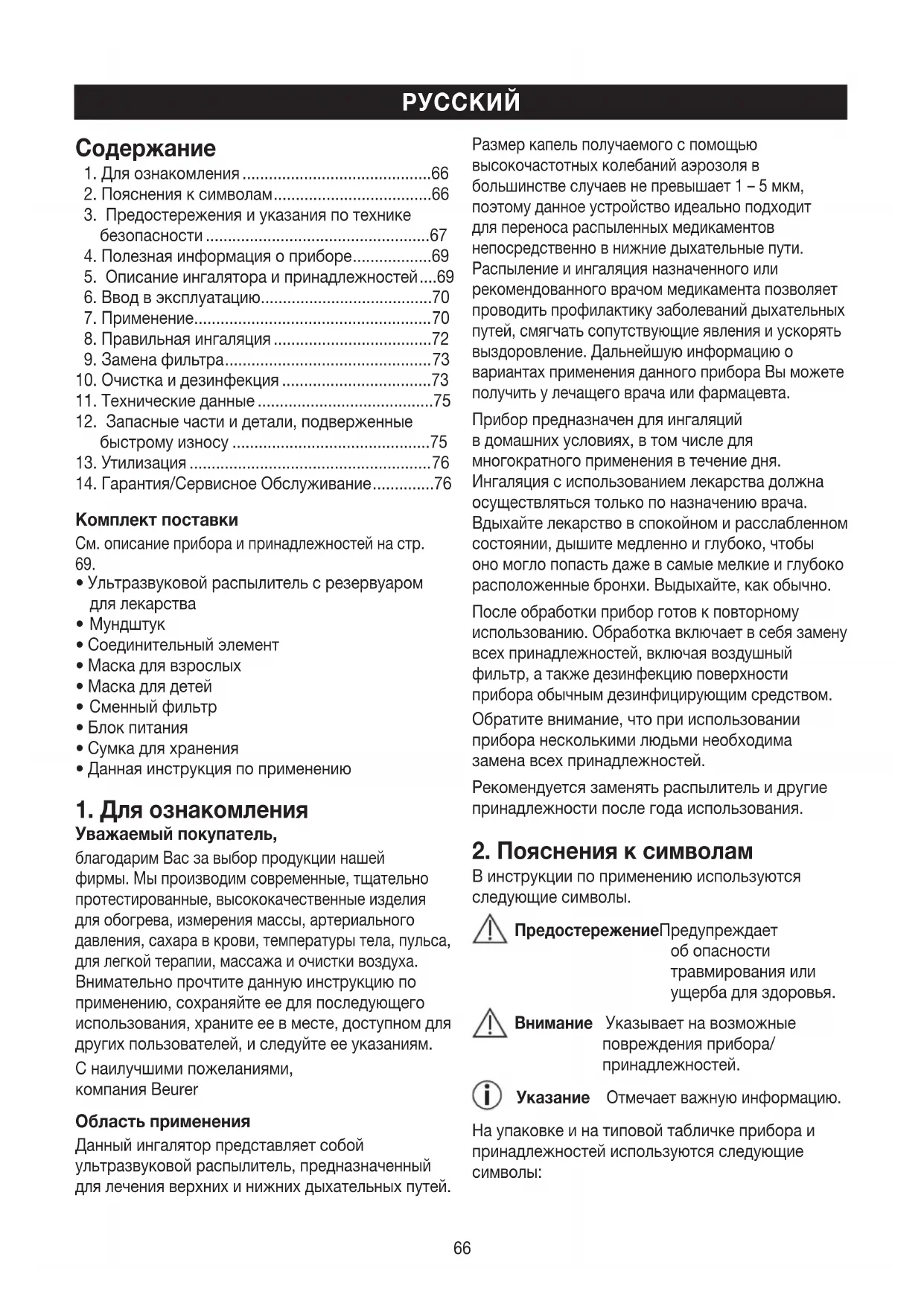 Уважаемый покупатель, благодарим Вас за выбор продукции нашей фирмы. Мы производим современные, тщательно протестированные, высококачественные изделия для обогрева, измерения массы, артериального давления, сахара в крови, температуры тела, пульса, для легкой терапии, массажа и очистки воздуха. Внимательно прочтите данную инструкцию по применению, сохраняйте ее для последующего использования, храните ее в месте, доступном для других пользователей, и следуйте ее указаниям. С наилучшими пожеланиями, компания Beurer Область применения Данный ингалятор представляет собой ультразвуковой распылитель, предназначенный для лечения верхних и нижних дыхательных путей. Размер капель получаемого с помощью высокочастотных колебаний аэрозоля в большинстве случаев не превышает 1 – 5 мкм, поэтому данное устройство идеально подходит для переноса распыленных медикаментов непосредственно в нижние дыхательные пути. Распыление и ингаляция назначенного или рекомендованного врачом медикамента позволяет проводить профилактику заболеваний дыхательных путей, смягчать сопутствующие явления и ускорять выздоровление. Дальнейшую информацию о вариантах применения данного прибора Вы можете получить у лечащего врача или фармацевта. Прибор предназначен для ингаляций в домашних условиях, в том числе для многократного применения в течение дня. Ингаляция с использованием лекарства должна осуществляться только по назначению врача. Вдыхайте лекарство в спокойном и расслабленном состоянии, дышите медленно и глубоко, чтобы оно могло попасть даже в самые мелкие и глубоко расположенные бронхи. Выдыхайте, как обычно. После обработки прибор готов к повторному использованию. Обработка включает в себя замену всех принадлежностей, включая воздушный фильтр, а также дезинфекцию поверхности прибора обычным дезинфицирующим средством. Обратите внимание, что при использовании прибора несколькими людьми необходима замена всех принадлежностей. Рекомендуется заменять распылитель и другие принадлежности после года использования.
