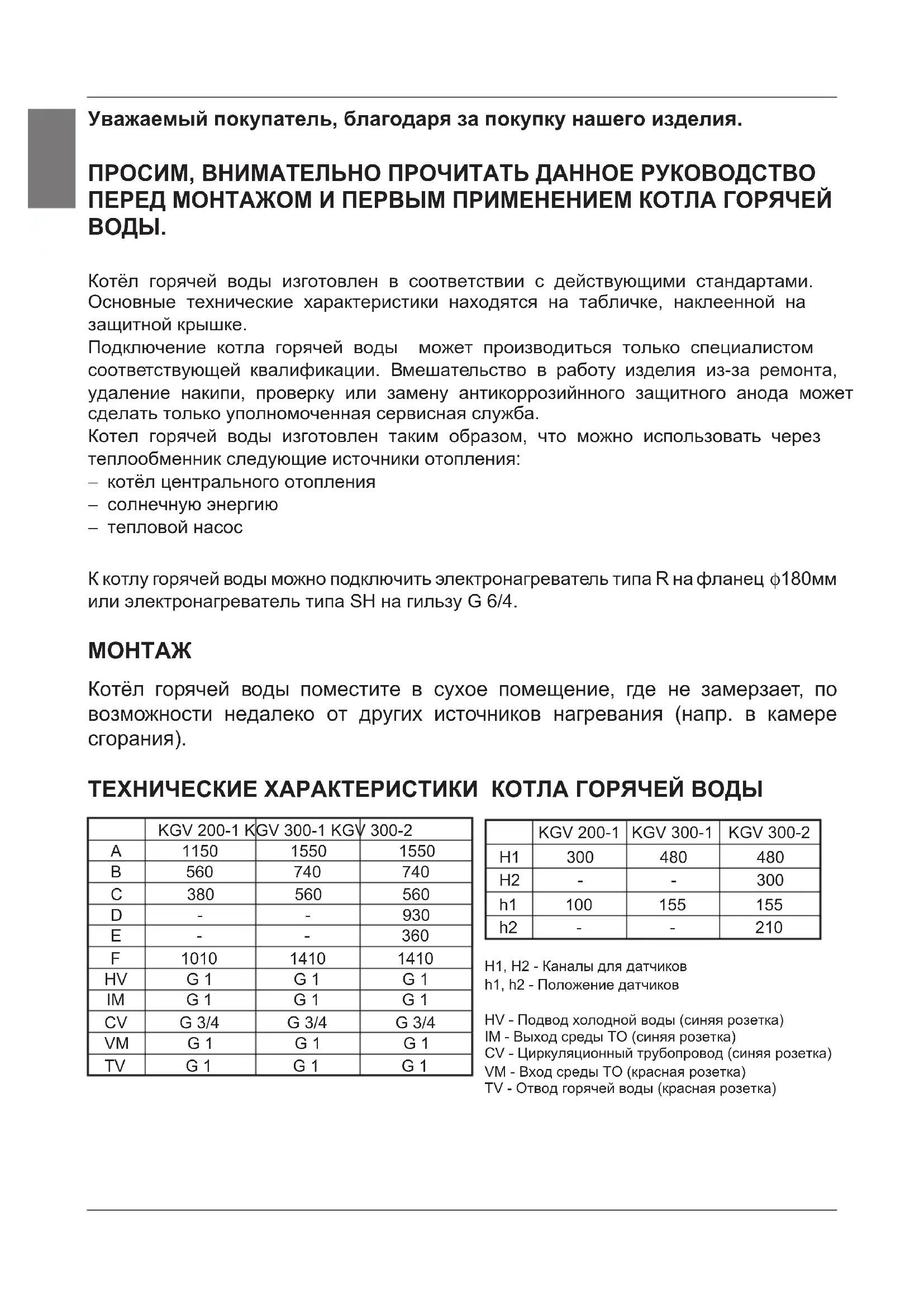 H1 300 480 480 H2 - - 300 h1 100 155 155 h2 - - 210 H1, H2 - Каналы для датчиков h1, h2 - Положение датчиков HV - Подвод холодной воды (синяя розетка) IM - Выход среды TO (синяя розетка) CV - Циркуляционный трубопровод (синяя розетка) VM - Вход среды TO (красная розетка) TV - Отвод горячей воды (красная розетка) y|z¥¥ Тип KGV 200-1 KGV 300-1 KGV 300-2 объём нагревателя (l) 200 285 280 Номинальное давление (MPa) 0,6 Вес/наполненного водой (kg) 82 / 282 112 / 397 134 / 414 Противокоррозионная защита котла эмалированный / Мg анод толщина изоляции (mm) 57 Ступень защиты от влаги IP 21 ТО - Теплообменника На задней стенке котла горячей воды находятся каналы для датчиков (H1, H2), где можно вставить датчики для регулировки системного соединения котла горячей воды и других источников отопления. Доступ до каналов находится под контактом защитной оболочки прибл. на половине высоты котла горячей воды. Датчик вставьте в канал и фиксируйте с помощью приложенной резиновой пробки. Рекомендуемое положение датчиков (h1, h2) в каналах обозначено на рисунке: - В случае, если датчик установите выше рекомендуемого положения, то термостат быстрее активируется, периоды работы циркуляционного насоса становятся более короткими, разница между температурой воды в котле и нагреваемой средой будет больше после выключения термостата, вследствие того количество и температура горячей воды в котле будут уменьшаться, - В случае, если датчик установите ниже рекомендуемого положения, то периоды работы циркуляционного насоса становятся более длинными, разница между температурой нагреваемой среды и достигнутой температурой воды в котле будет меньше, вследствие того температура и количество воды в котле будут увеличиваться. Tepmometp