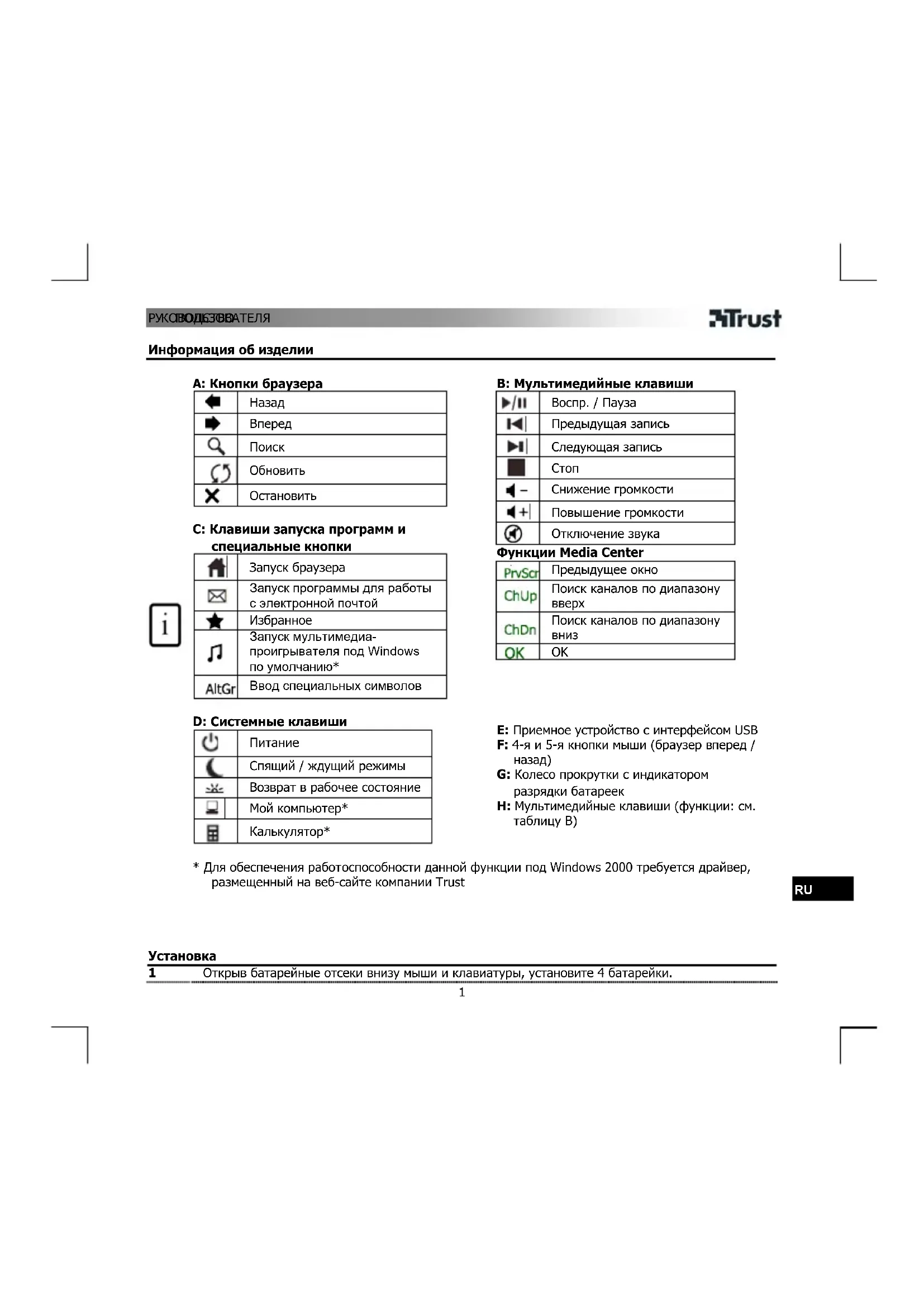 - Для обеспечения работоспособности данной функции под Windows 2000 требуется драйвер, размещенный на веб-сайте компании Trust