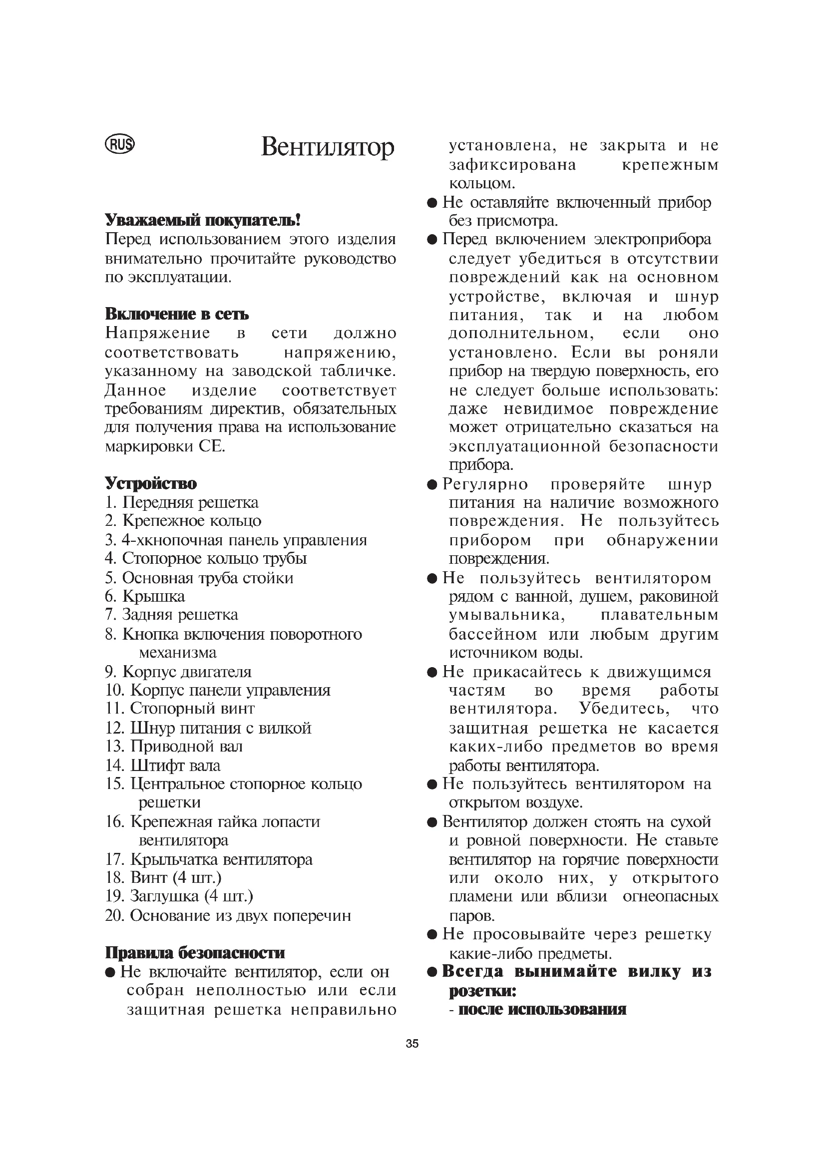 ● Регулярно проверяйте шнур питания на наличие возможного повреждения. Не пользуйтесь прибором при обнаружении повреждения. ● Не пользуйтесь вентилятором рядом с ванной, душем, раковиной умывальника, плавательным бассейном или любым другим источником воды. ● Не прикасайтесь к движущимся частям во время работы вентилятора. Убедитесь, что защитная решетка не касается каких-либо предметов во время работы вентилятора. ● Не пользуйтесь вентилятором на открытом воздухе. ● Вентилятор должен стоять на сухой и ровной поверхности. Не ставьте вентилятор на горячие поверхности или около них, у открытого пламени или вблизи огнеопасных