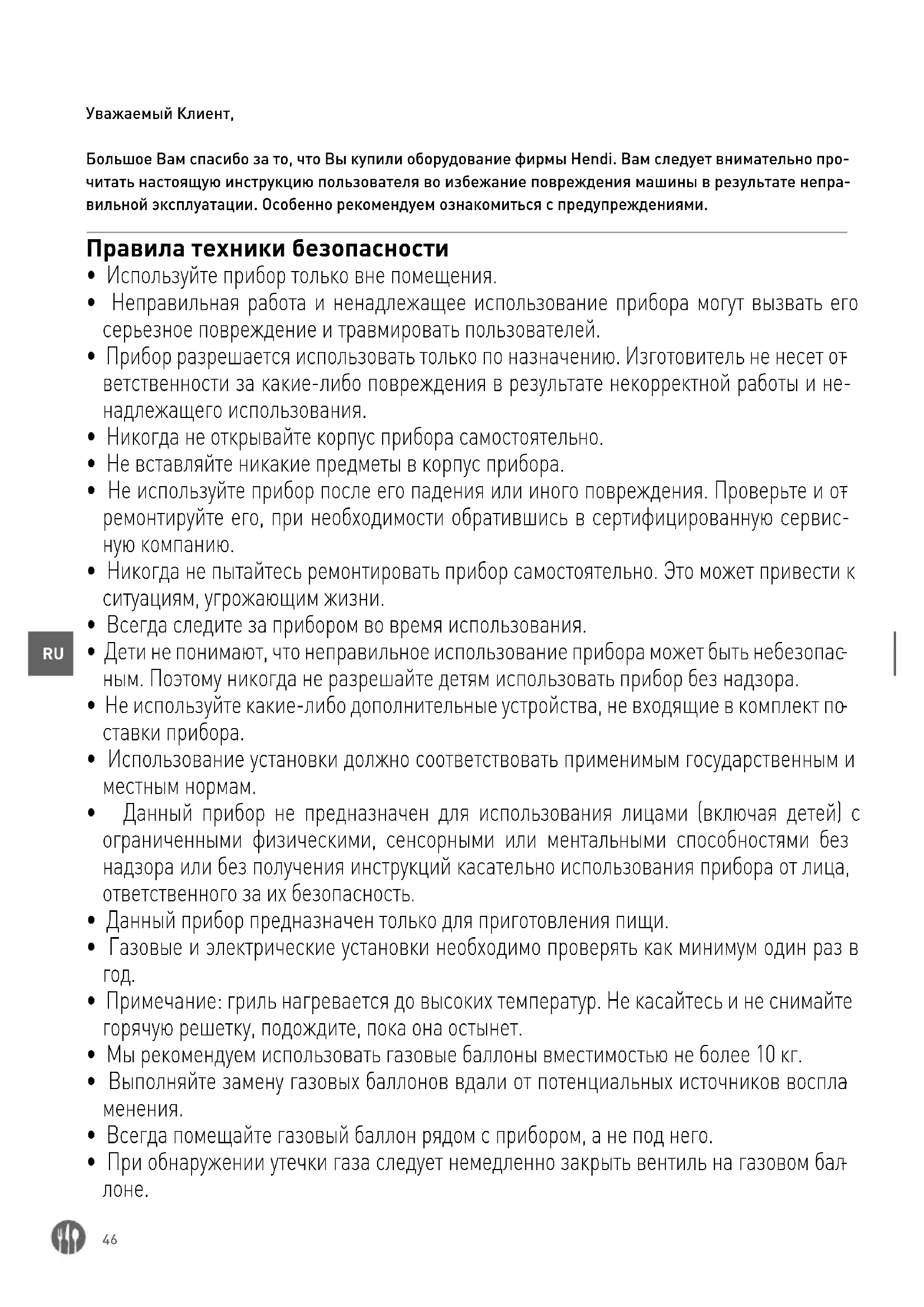 Уважаемый Клиент, Большое Вам спасибо за то, что Вы купили оборудование фирмы Hendi. Вам следует внимательно про- читать настоящую инструкцию пользователя во избежание повреждения машины в результате непра- вильной эксплуатации. Особенно рекомендуем ознакомиться с предупреждениями. Правила техники безопасности