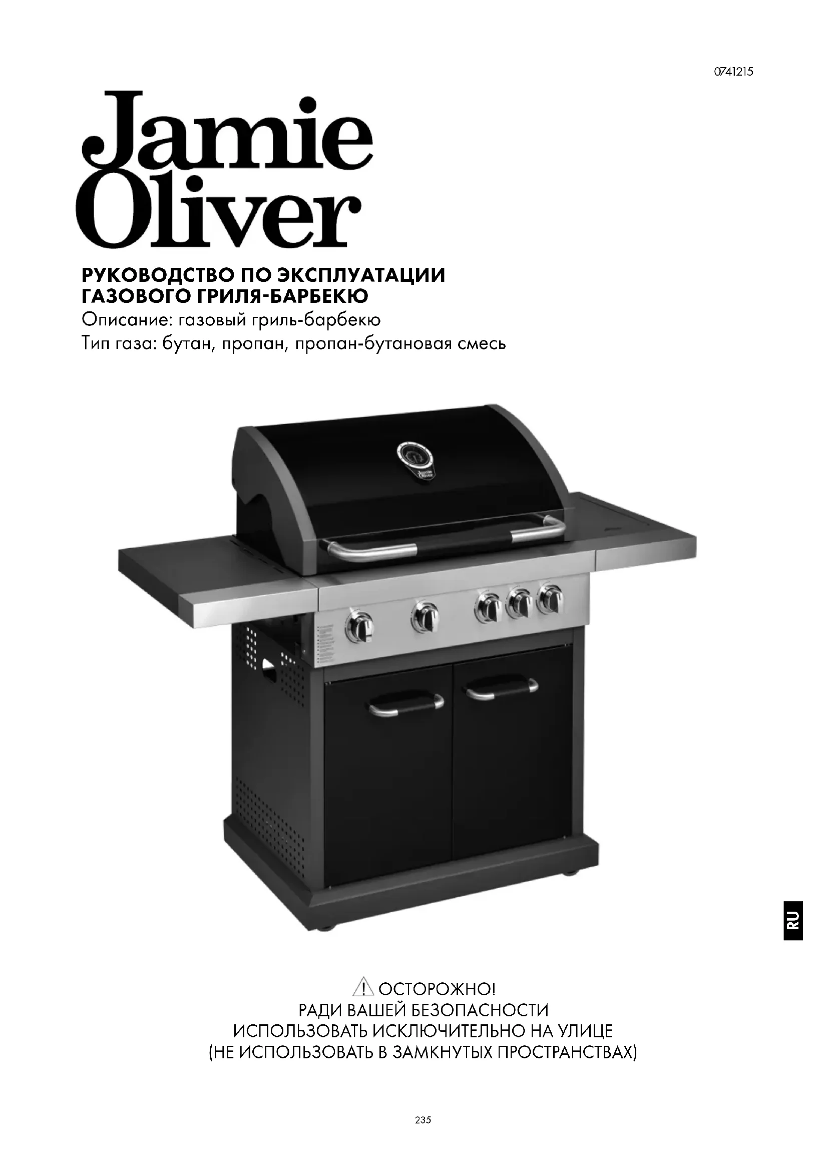 Внимательно прочтите данное руководство и убедитесь в том, что барбекю установлено, собрано, обслуживается и используется в соответствии с данным руководством. Несоблюдение требований данного руководства может привести к тяжелой травме и/или материальным убыткам. По вопросам, связанным со сборкой или эксплуатацией барбекю, обращайтесь к дилеру, поставщику газа, изготовителю, агенту или см. раздел Support (Поддержка) на сайте www.jamieoliverbbq.com. Примечания для пользователя «НЕ ИСПОЛЬЗОВАТЬ В ПОМЕЩЕНИЯХ». «ВНИМАТЕЛЬНО ПРОЧЕСТЬ РУКОВОДСТВО ПЕРЕД ИСПОЛЬЗОВАНИЕМ БАРБЕКЮ». «ОСТОРОЖНО! ОТКРЫТЫЕ ЧАСТИ МОГУТ СИЛЬНО НАГРЕТЬСЯ. БЕРЕЧЬ ОТ ДЕТЕЙ». «ЗАПРЕЩАЕТСЯ ПЕРЕМЕЩАТЬ барбекю ВО ВРЕМЯ ИСПОЛЬЗОВАНИЯ». «ПОСЛЕ ИСПОЛЬЗОВАНИЯ ПЕРЕКРЫТЬ ПОДАЧУ ГАЗА ИЗ БАЛЛОНА». ТЕХНИЧЕСКАЯ ИНФОРМАЦИЯ НОМЕР МОДЕЛИ PRO 4S (4основные горелки + боковая горелка)