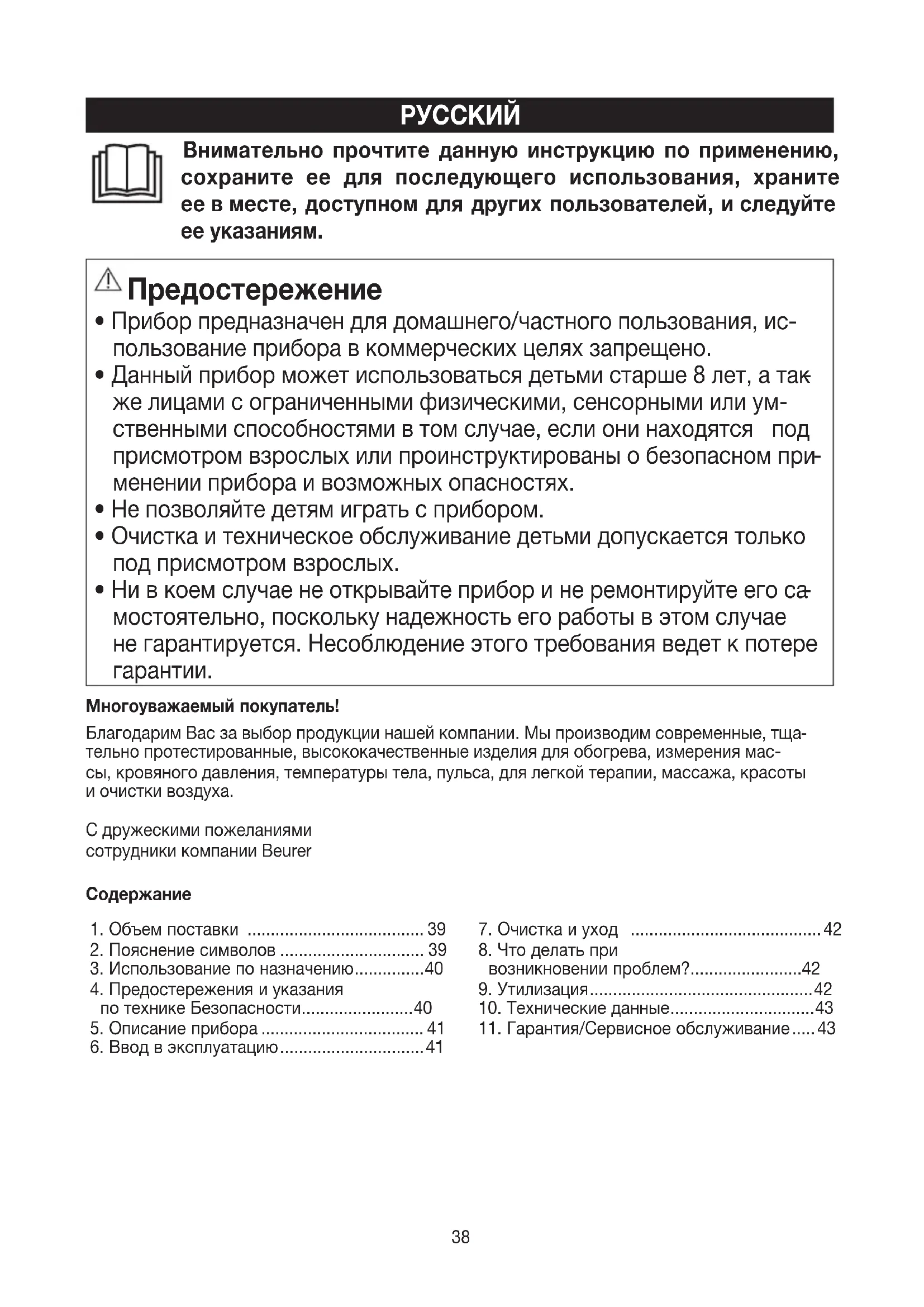 тельно протестированные, высококачественные изделия для обогрева, измерения мас- сы, кровяного давления, температуры тела, пульса, для легкой терапии, массажа, красоты иочистки воздуха. С дружескими пожеланиями сотрудники компании Beurer