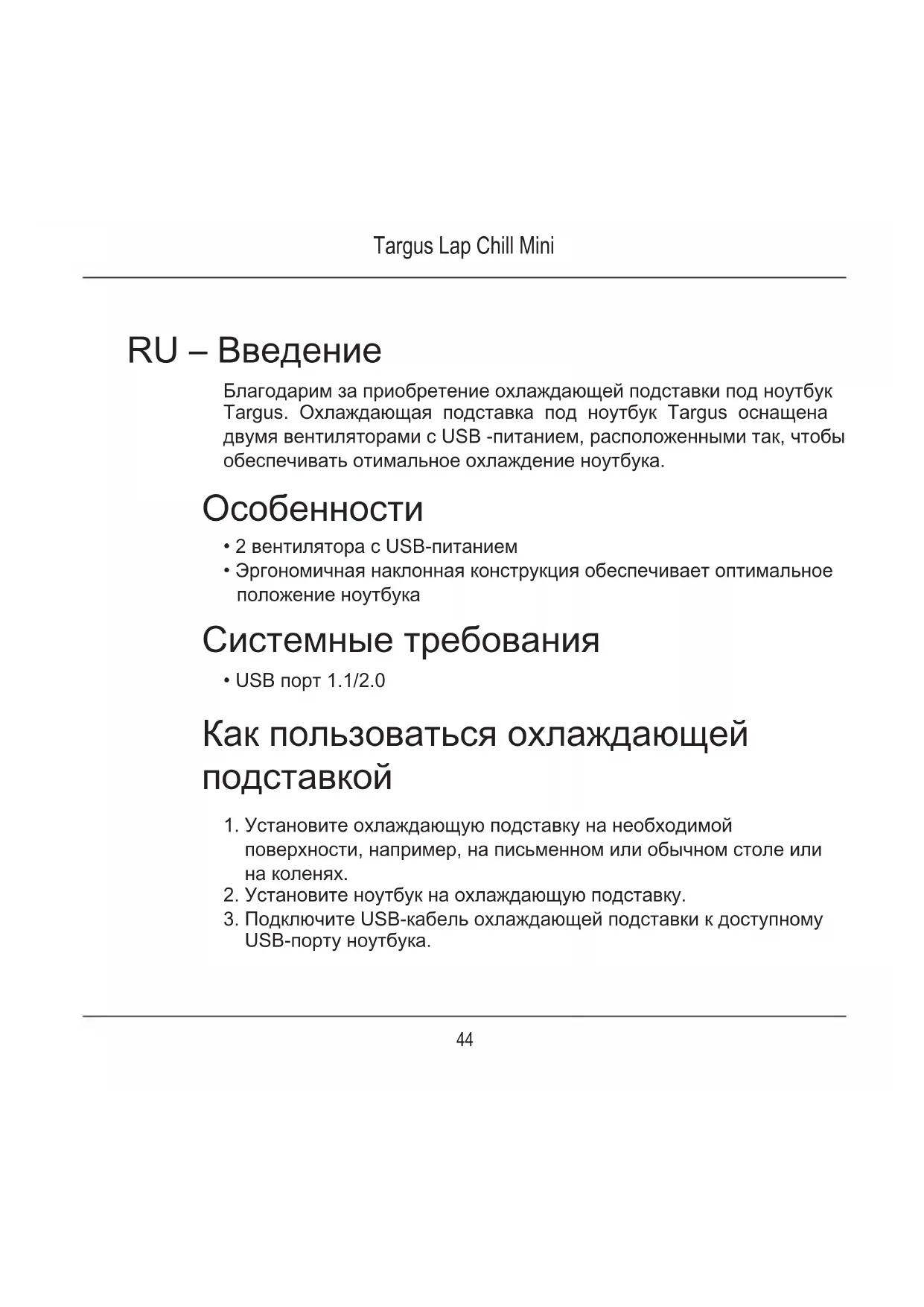 RU – Введение Благодарим за приобретение охлаждающей подставки под ноутбук Targus. Охлаждающая подставка под ноутбук Targus оснащена двумя вентиляторами с USB -питанием, расположенными так, чтобы обеспечивать отимальное охлаждение ноутбука. Особенности