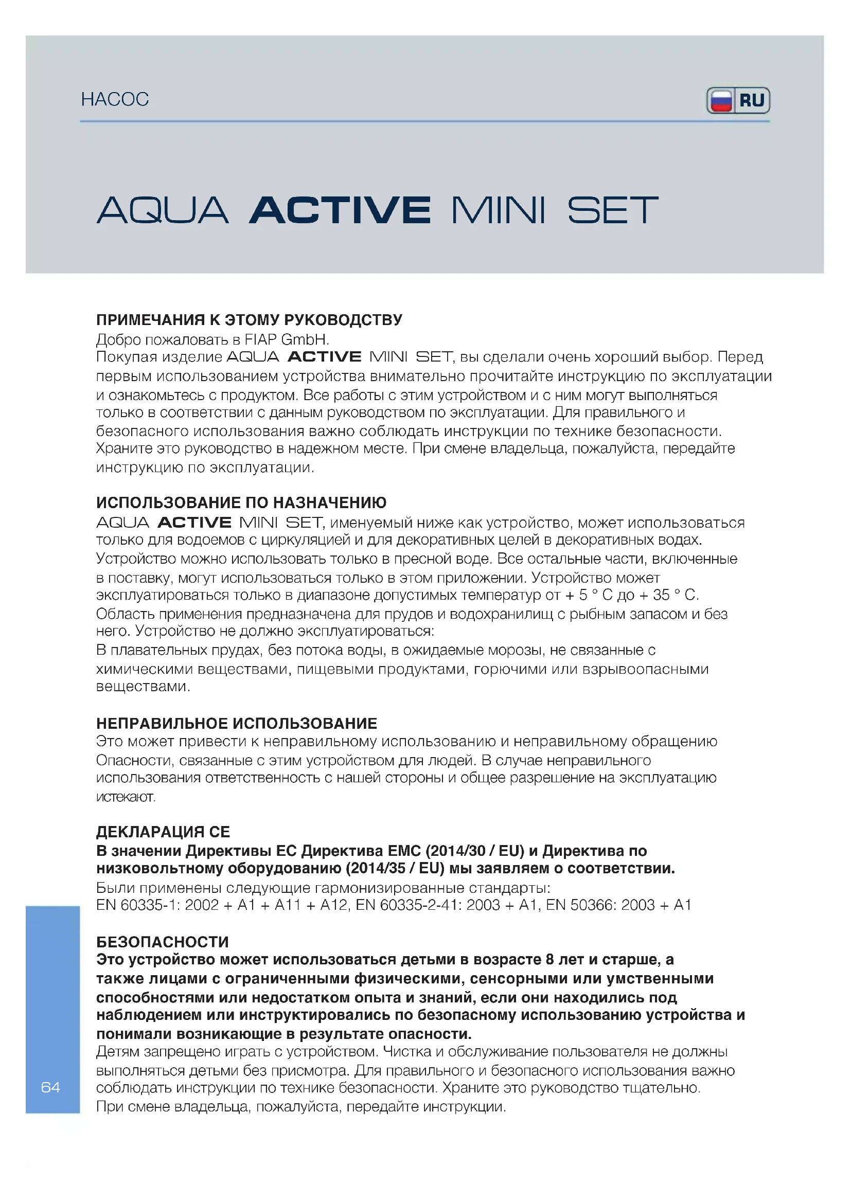 РУКОВОДСТВО ПОЛЬЗОВАТЕЛЯ Aqua Active Mini set 3000 Fiap