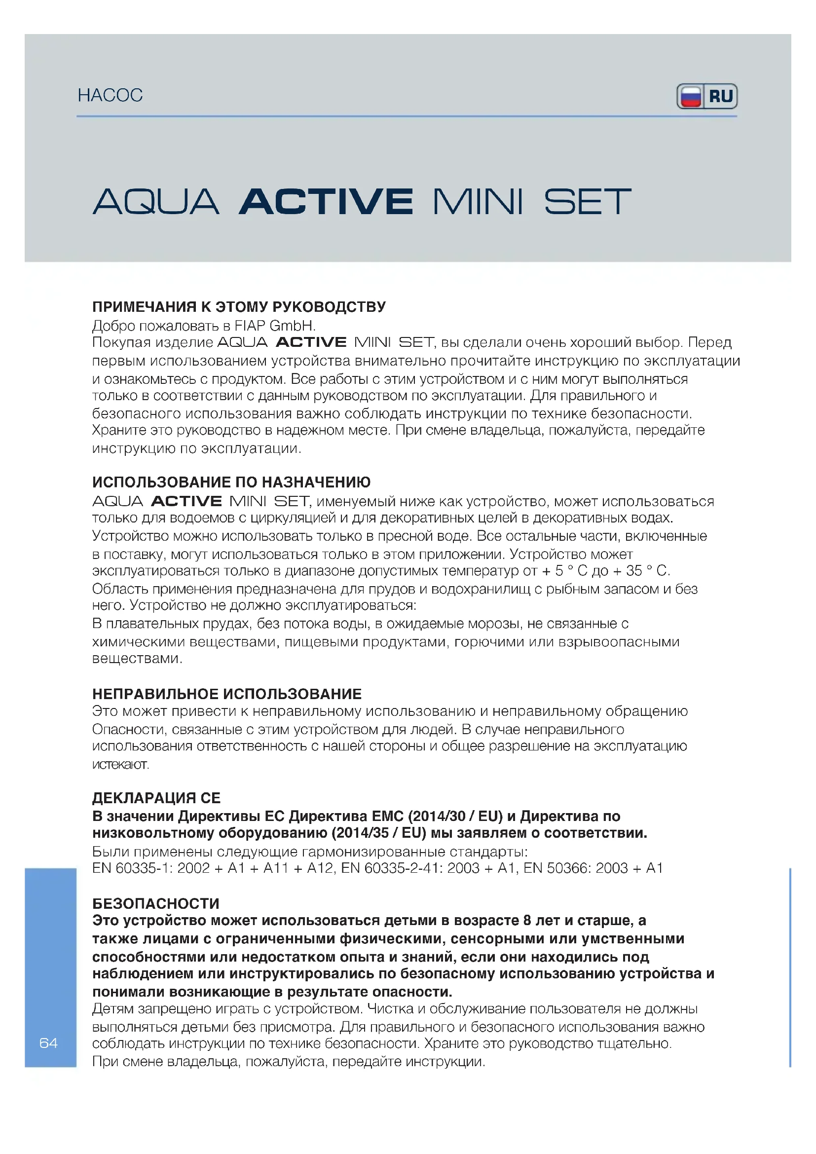 РУКОВОДСТВО ПОЛЬЗОВАТЕЛЯ Aqua Active Mini set 1000 Fiap