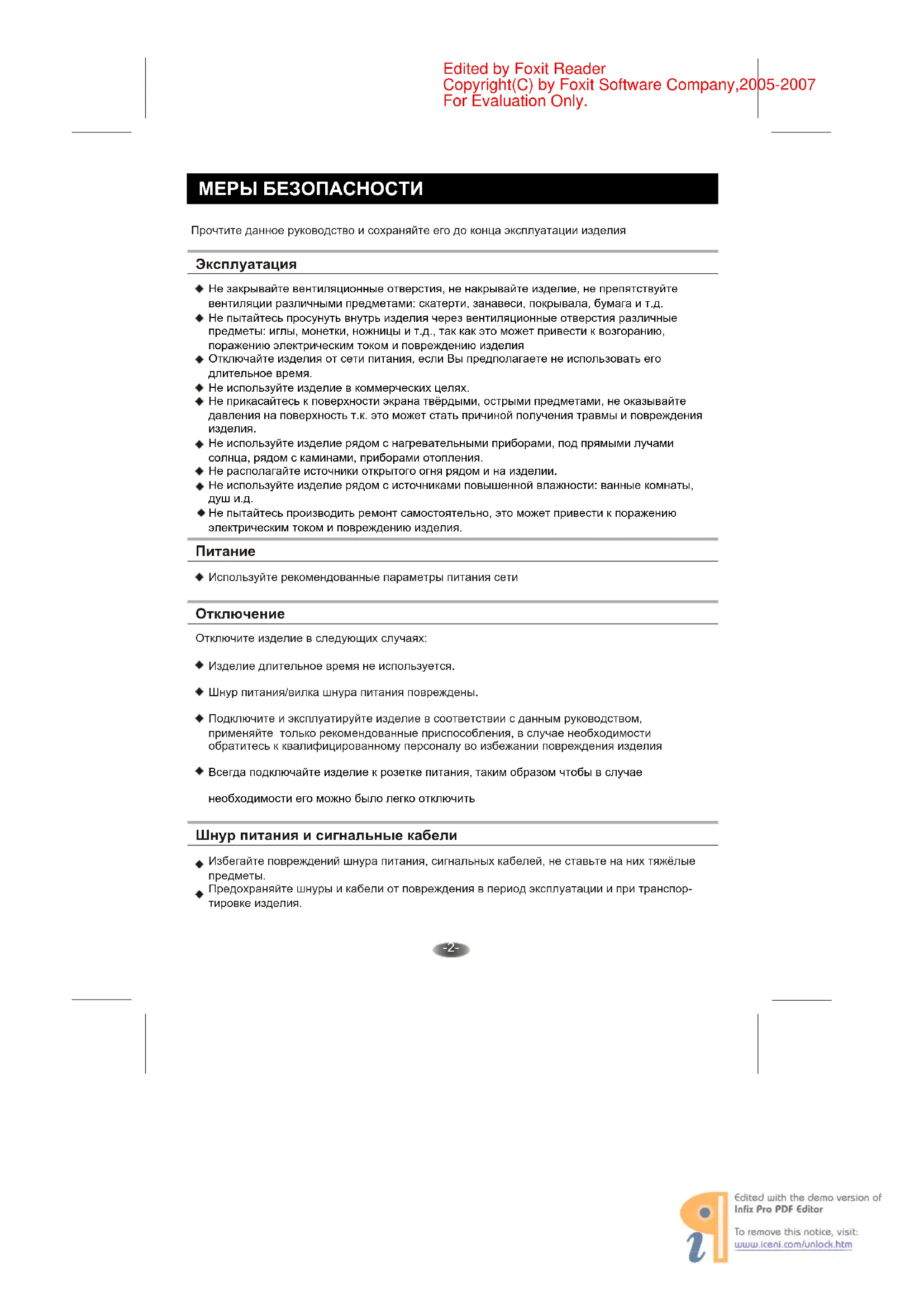 ◆ Отключайте изделия от сети питания, если Вы предполагаете не использовать его длительное время.
