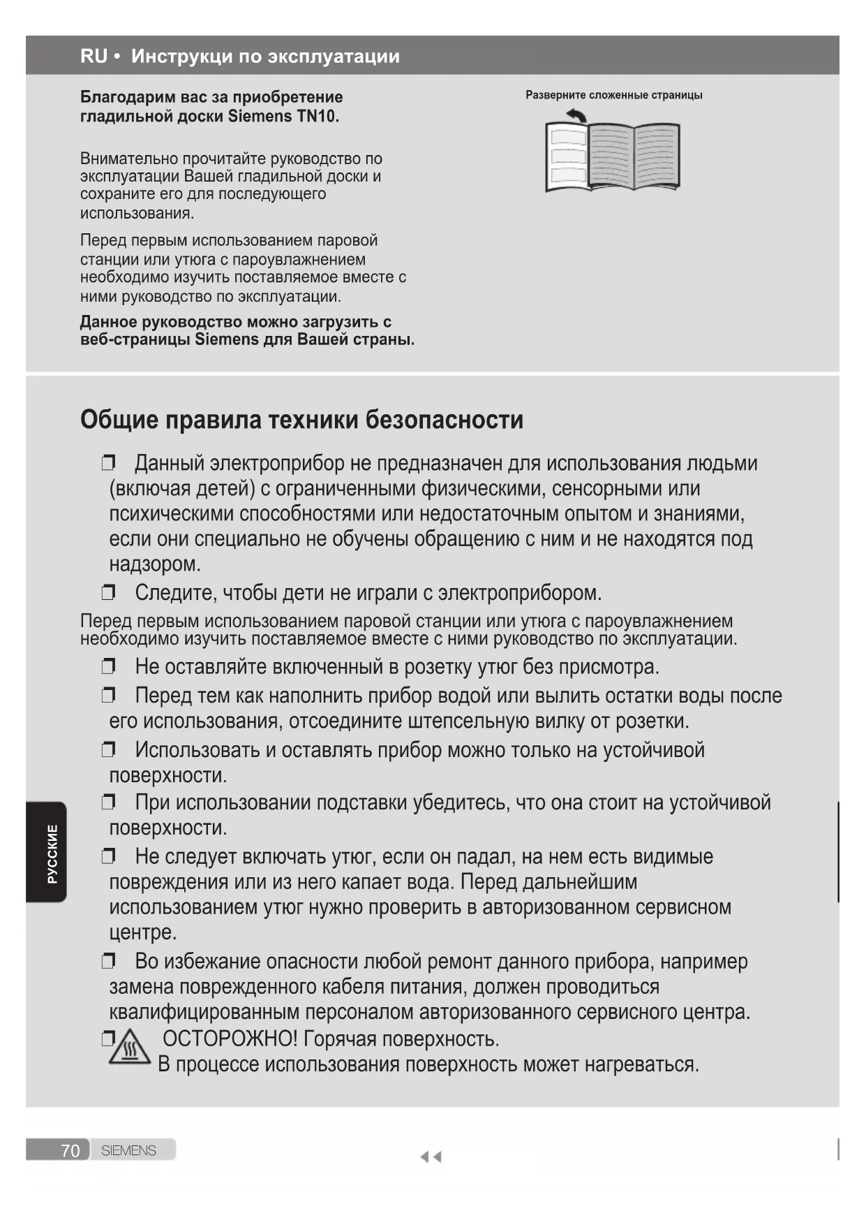 ОСТОРОЖНО! Горячая поверхность. В процессе использования поверхность может нагреваться. RU • Инструкци по эксплуатации Благодарим вас за приобретение гладильной доски Siemens TN10. Внимательно прочитайте руководство по эксплуатации Вашей гладильной доски и сохраните его для последующего использования. Перед первым использованием паровой станции или утюга с пароувлажнением необходимо изучить поставляемое вместе с ними руководство по эксплуатации. Данное руководство можно загрузить с веб-страницы Siemens для Вашей страны. Разверните сложенные страницы71 S I E M E N S