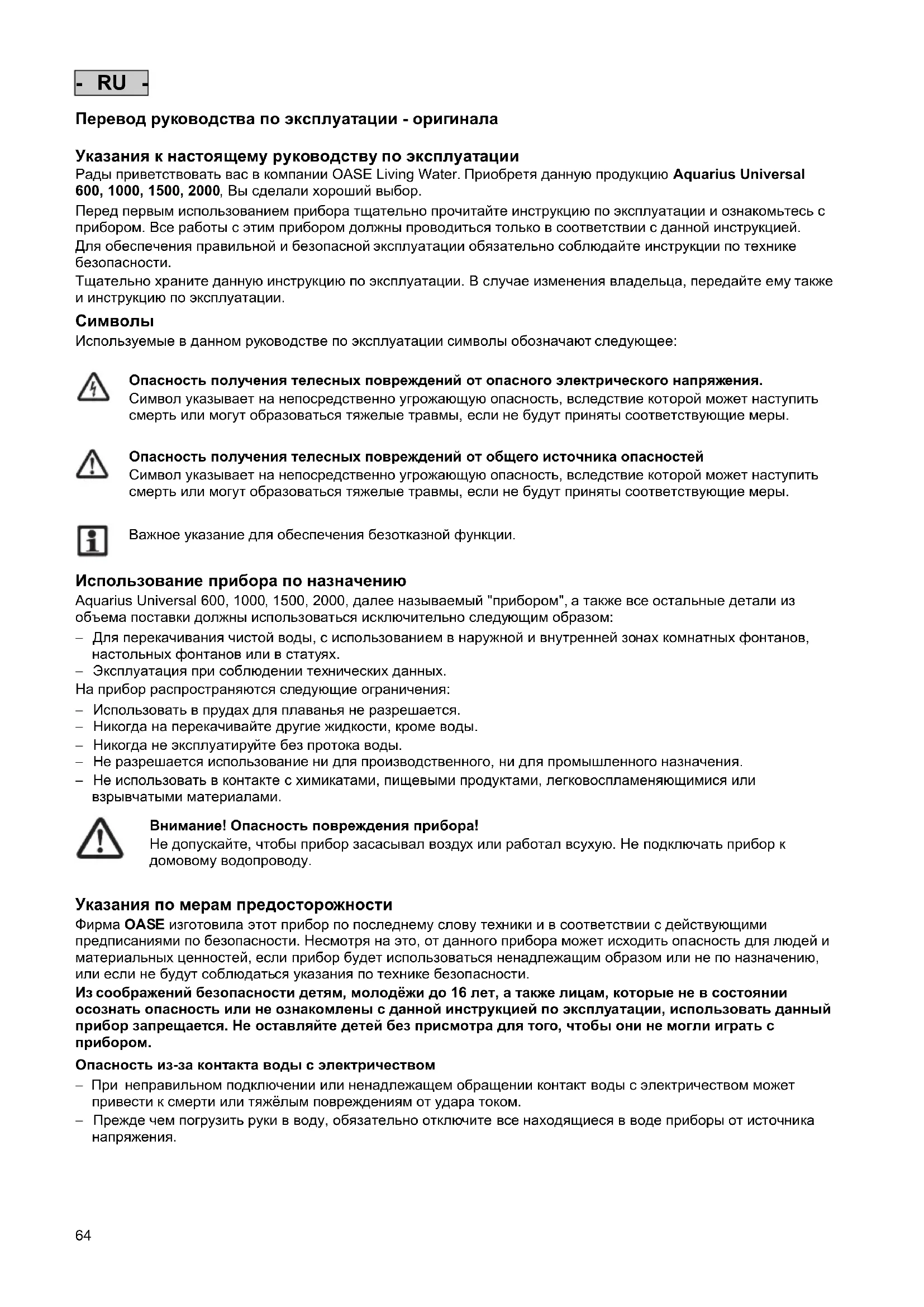 Пошкоджений корпус не підлягає ремонту, забороняється використовувати пошкоджений кабель. Пристрій необхідно відповідним чином утилізувати.64 - RU - Перевод руководства по эксплуатации - оригинала Указания к настоящему руководству по эксплуатации Рады приветствовать вас в компании OASE Living Water. Приобретя данную продукцию Aquarius Universal 600, 1000, 1500, 2000, Вы сделали хороший выбор. Перед первым использованием прибора тщательно прочитайте инструкцию по эксплуатации и ознакомьтесь с прибором. Все работы с этим прибором должны проводиться только в соответствии с данной инструкцией. Для обеспечения правильной и безопасной эксплуатации обязательно соблюдайте инструкции по технике безопасности. Тщательно храните данную инструкцию по эксплуатации. В случае изменения владельца, передайте ему также и инструкцию по эксплуатации.