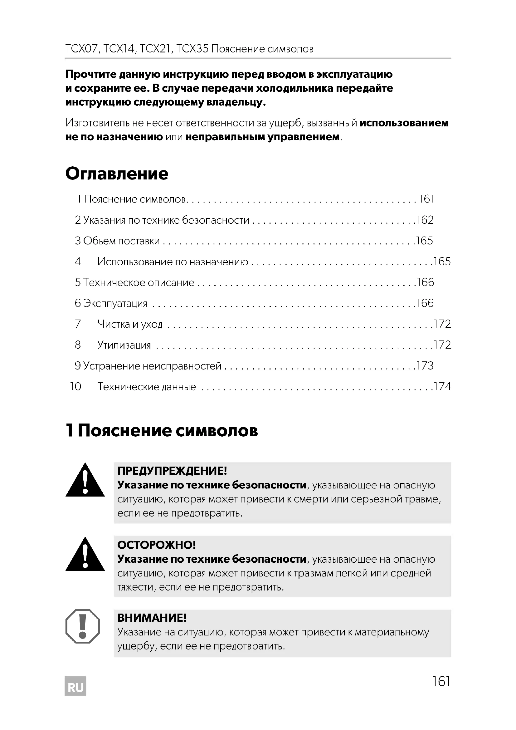 Указание на ситуацию, которая может привести к материальному ущербу, если ее не предотвратить. TCX07-TCX35-OPM-EMEA16.book Seite 161 Donnerstag, 11. Juli 2019 12:20 12RU Указания по технике безопасности TCX07, TCX14, TCX21, TCX35