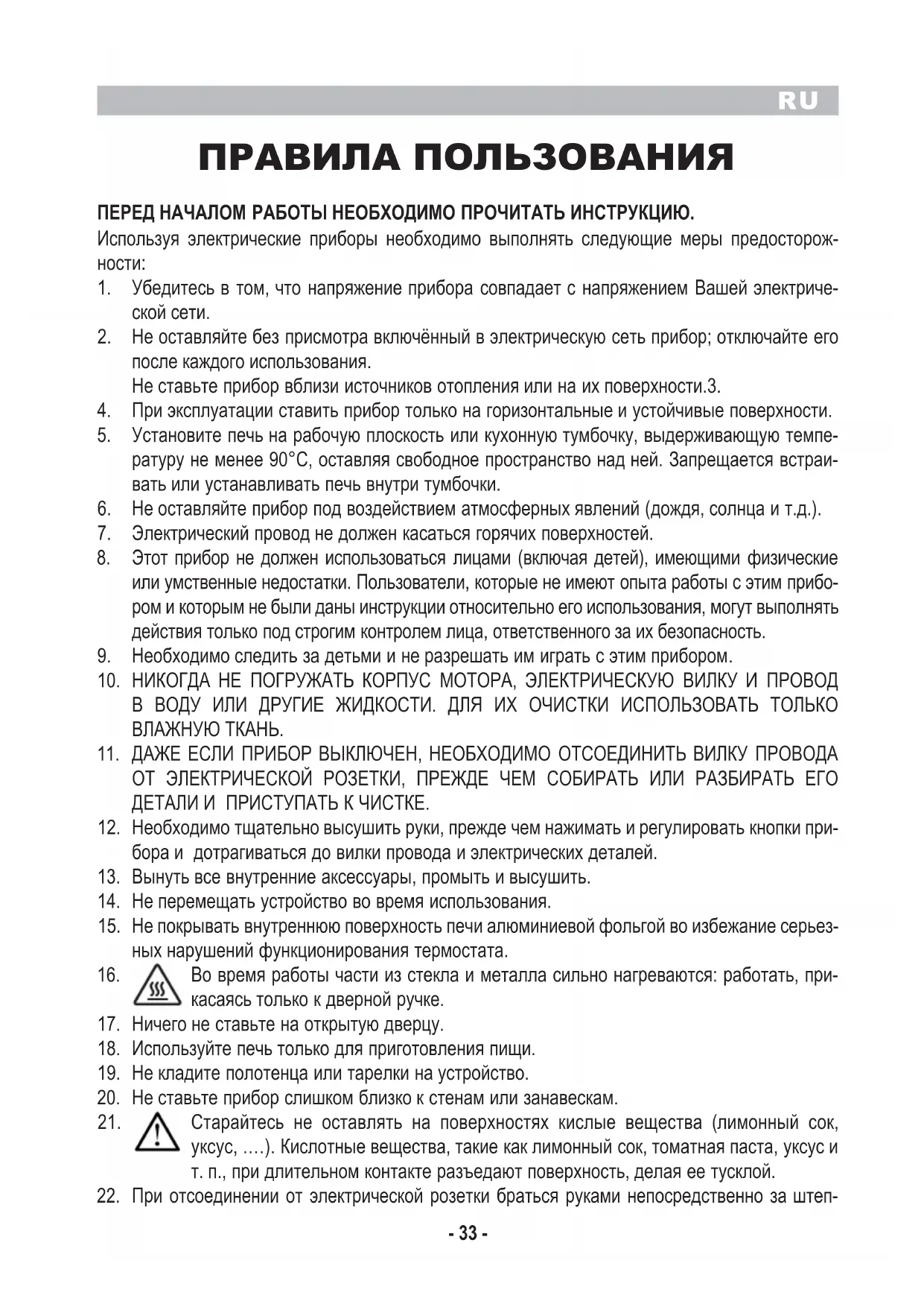 Не оставляйте без присмотра включённый в электрическую сеть прибор; отключайте его 2. после каждого использования. Не ставьте прибор вблизи источников отопления или на их поверхности.3. При эксплуатации ставить прибор только на горизонтальные и устойчивые поверхности.4. Установите печь на рабочую плоскость или кухонную тумбочку, выдерживающую темпе-5. ратуру не менее 90°C, оставляя свободное пространство над ней. Запрещается встраи- вать или устанавливать печь внутри тумбочки. Не оставляйте прибор под воздействием атмосферных явлений (дождя, солнца и т.д.). 6. Электрический провод не должен касаться горячих поверхностей.7. Этот прибор не должен использоваться лицами (включая детей), имеющими физические 8. или умственные недостатки. Пользователи, которые не имеют опыта работы с этим прибо- ром и которым не были даны инструкции относительно его использования, могут выполнять действия только под строгим контролем лица, ответственного за их безопасность. Необходимо следить за детьми и не разрешать им играть с этим прибором. 9. НИКОГДА НЕ ПОГРУЖАТЬ КОРПУС МОТОРА, ЭЛЕКТРИЧЕСКУЮ ВИЛКУ И ПРОВОД 10. В ВОДУ ИЛИ ДРУГИЕ ЖИДКОСТИ. ДЛЯ ИХ ОЧИСТКИ ИСПОЛЬЗОВАТЬ ТОЛЬКО ВЛАЖНУЮ ТКАНЬ. ДАЖЕ ЕСЛИ ПРИБОР ВЫКЛЮЧЕН, НЕОБХОДИМО ОТСОЕДИНИТЬ ВИЛКУ ПРОВОДА 11. ОТ ЭЛЕКТРИЧЕСКОЙ РОЗЕТКИ, ПРЕЖДЕ ЧЕМ СОБИРАТЬ ИЛИ РАЗБИРАТЬ ЕГО ДЕТАЛИ И ПРИСТУПАТЬ К ЧИСТКЕ. Необходимо тщательно высушить руки, прежде чем нажимать и регулировать кнопки при-12. бора и дотрагиваться до вилки провода и электрических деталей. Вынуть все внутренние аксессуары, промыть и высушить.13. Не перемещать устройство во время использования.14. Не покрывать внутреннюю поверхность печи алюминиевой фольгой во избежание серьез-15. ных нарушений функционирования термостата. Во время работы части из стекла и металла сильно нагреваются: работать, при-16. касаясь только к дверной ручке. Ничего не ставьте на открытую дверцу.17. Используйте печь только для приготовления пищи.18. Не кладите полотенца или тарелки на устройство.19. Не ставьте прибор слишком близко к стенам или занавескам.20. Старайтесь не оставлять на поверхностях кислые вещества (лимонный сок, 21. уксус, .…). Кислотные вещества, такие как лимонный сок, томатная паста, уксус и т. п., при длительном контакте разъедают поверхность, делая ее тусклой. При отсоединении от электрической розетки браться руками непосредственно за штеп-22.RU
