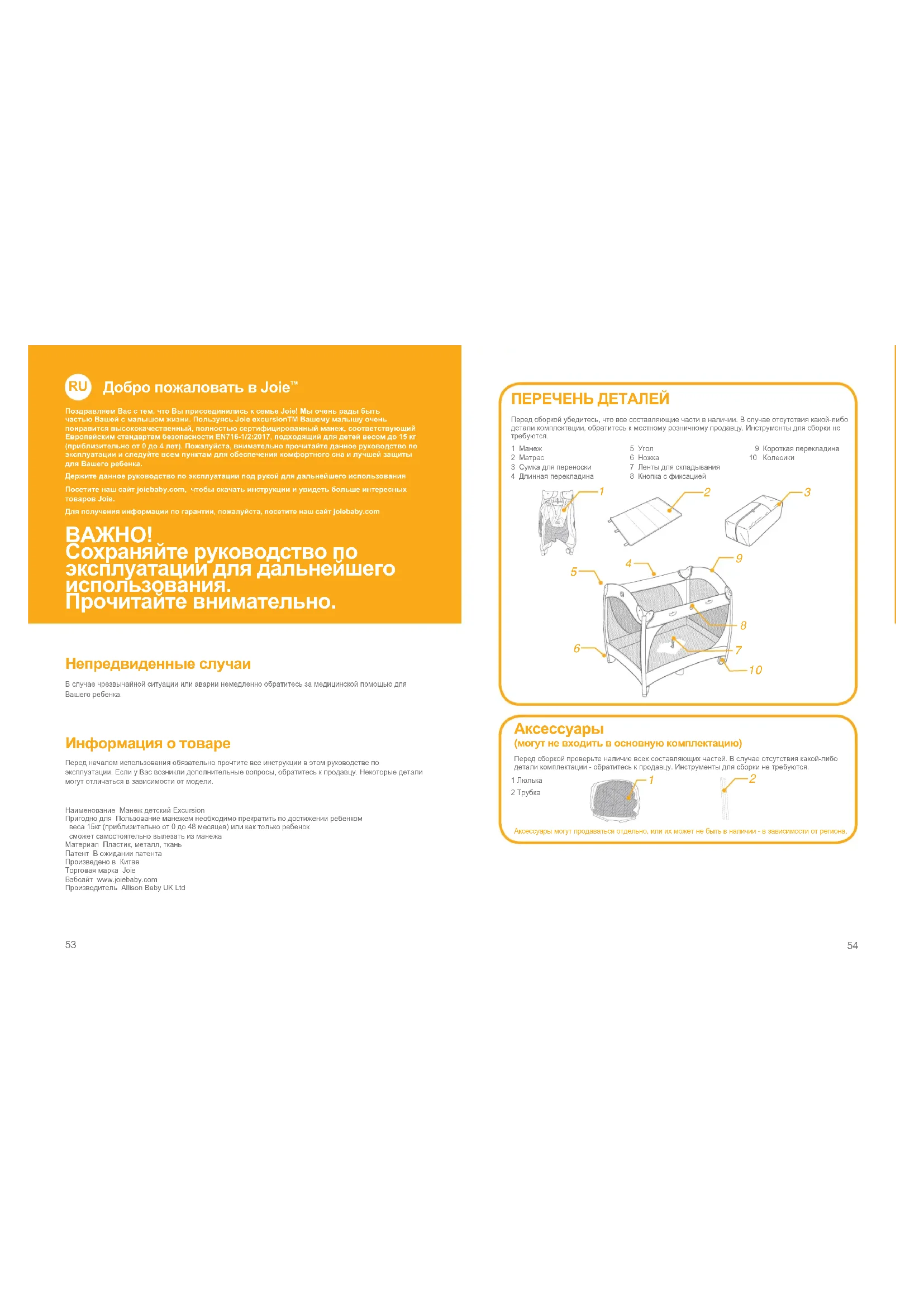 В случае чрезвычайной ситуации или аварии немедленно обратитесь за медицинской помощью для Вашего ребенка. Перед началом использования обязательно прочтите все инструкции в этом руководстве по эксплуатации. Если у Вас возникли дополнительные вопросы, обратитесь к продавцу. Некоторые детали могут отличаться в зависимости от модели.Наименование Манеж детский Excursion Пригодно для Пользование манежем необходимо прекратить по достижении ребенком веса 15кг (приблизительно от 0 до 48 месяцев) или как только ребенок сможет самостоятельно вылезать из манежа Материал Пластик, металл, ткань Патент В ожидании патента Произведено в Китае Торговая марка Joie Вэбсайт www.joiebaby.com Производитель Allison Baby UK Ltd1 Манеж2 Матрас3 Сумка для переноски4 Длинная перекладина5 Угол6 Ножка7 Ленты для складывания8 Кнопка с фиксацией 9 Короткая перекладина10 Колесики Перед сборкой убедитесь, что все составляющие части в наличии. В случае отсутствия какой-либо детали комплектации, обратитесь к местному розничному продавцу. Инструменты для сборки не требуются.