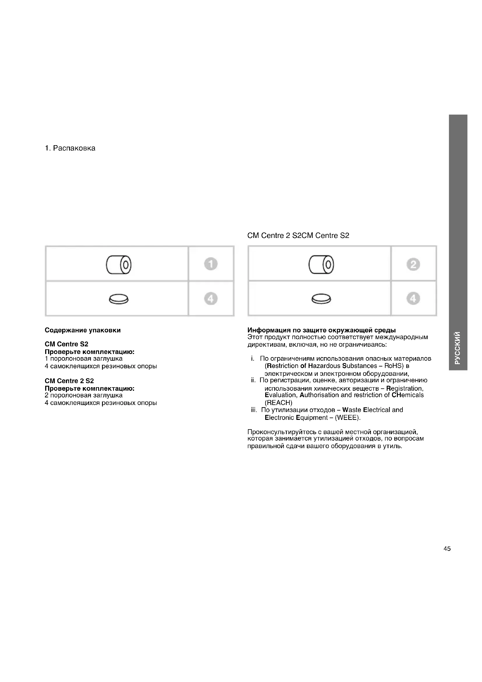 Содержание упаковки CM Centre S2 Проверьте комплектацию: 1 поролоновая заглушка 4 самоклеящихся резиновых опоры CM Centre 2 S2 Проверьте комплектацию: 2 поролоновая заглушка 4 самоклеящихся резиновых опоры Информация по защите окружающей среды Этот продукт полностью соответствует международным директивам, включая, но не ограничиваясь: