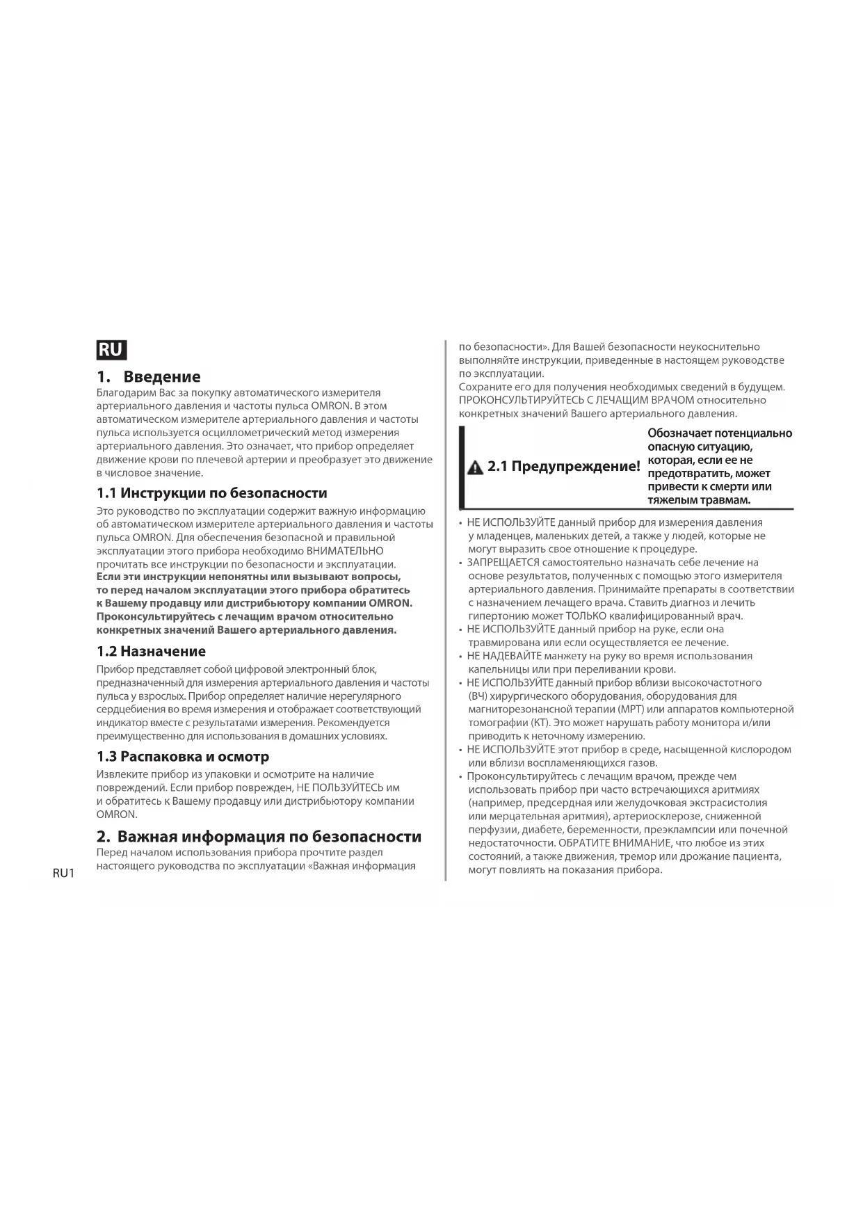 Это руководство по эксплуатации содержит важную информацию об автоматическом измерителе артериального давления и частоты пульса OMRON. Для обеспечения безопасной и правильной эксплуатации этого прибора необходимо ВНИМАТЕЛЬНО прочитать все инструкции по безопасности и эксплуатации. Если эти инструкции непонятны или вызывают вопросы, то перед началом эксплуатации этого прибора обратитесь к Вашему продавцу или дистрибьютору компании OMRON. Проконсультируйтесь с лечащим врачом относительно конкретных значений Вашего артериального давления.