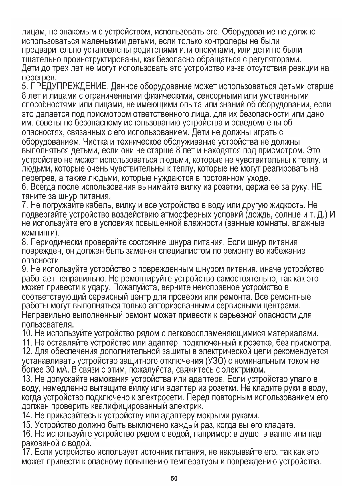 8 лет и лицами с ограниченными физическими, сенсорными или умственными способностями или лицами, не имеющими опыта или знаний об оборудовании, если это делается под присмотром ответственного лица. для их безопасности или дано им. советы по безопасному использованию устройства и осведомлены об опасностях, связанных с его использованием. Дети не должны играть с оборудованием. Чистка и техническое обслуживание устройства не должны выполняться детьми, если они не старше 8 лет и находятся под присмотром. Это устройство не может использоваться людьми, которые не чувствительны к теплу, и людьми, которые очень чувствительны к теплу, которые не могут реагировать на перегрев, а также людьми, которые нуждаются в постоянном уходе.