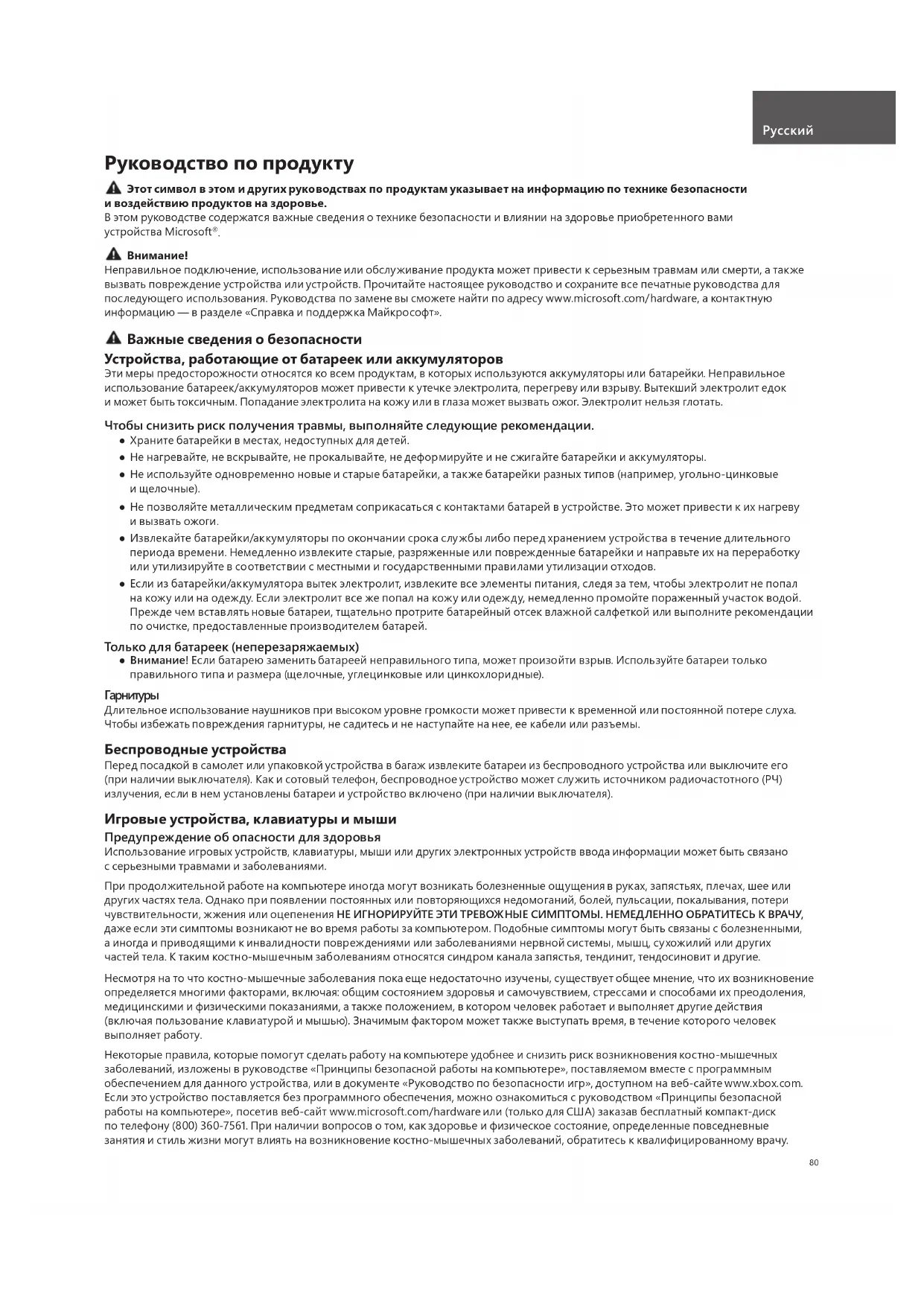 Неправильное подключение, использование или обслуживание продукта может привести к серьезным травмам или смерти, а также вызвать повреждение устройства или устройств. Прочитайте настоящее руководство и сохраните все печатные руководства для последующего использования. Руководства по замене вы сможете найти по адресу www.microsoft.com/hardware, а контактную информацию — в разделе «Справка и поддержка Майкрософт». Важные сведения о безопасности Устройства, работающие от батареек или аккумуляторов Эти меры предосторожности относятся ко всем продуктам, в которых используются аккумуляторы или батарейки. Неправильное использование батареек/аккумуляторов может привести к утечке электролита, перегреву или взрыву. Вытекший электролит едок и может быть токсичным. Попадание электролита на кожу или в глаза может вызвать ожог. Электролит нельзя глотать. Чтобы снизить риск получения травмы, выполняйте следующие рекомендации. ●Храните батарейки в местах, недоступных для детей. ●Не нагревайте, не вскрывайте, не прокалывайте, не деформируйте и не сжигайте батарейки и аккумуляторы. ●Не используйте одновременно новые и старые батарейки, а также батарейки разных типов (например, угольно-цинковые и щелочные). ●Не позволяйте металлическим предметам соприкасаться с контактами батарей в устройстве. Это может привести к их нагреву и вызвать ожоги. ●Извлекайте батарейки/аккумуляторы по окончании срока службы либо перед хранением устройства в течение длительного периода времени. Немедленно извлеките старые, разряженные или поврежденные батарейки и направьте их на переработку или утилизируйте в соответствии с местными и государственными правилами утилизации отходов. ●Если из батарейки/аккумулятора вытек электролит, извлеките все элементы питания, следя за тем, чтобы электролит не попал на кожу или на одежду. Если электролит все же попал на кожу или одежду, немедленно промойте пораженный участок водой. Прежде чем вставлять новые батареи, тщательно протрите батарейный отсек влажной салфеткой или выполните рекомендации по очистке, предоставленные производителем батарей. Только для батареек (неперезаряжаемых) ● Внимание! Если батарею заменить батареей неправильного типа, может произойти взрыв. Используйте батареи только правильного типа и размера (щелочные, углецинковые или цинкохлоридные).