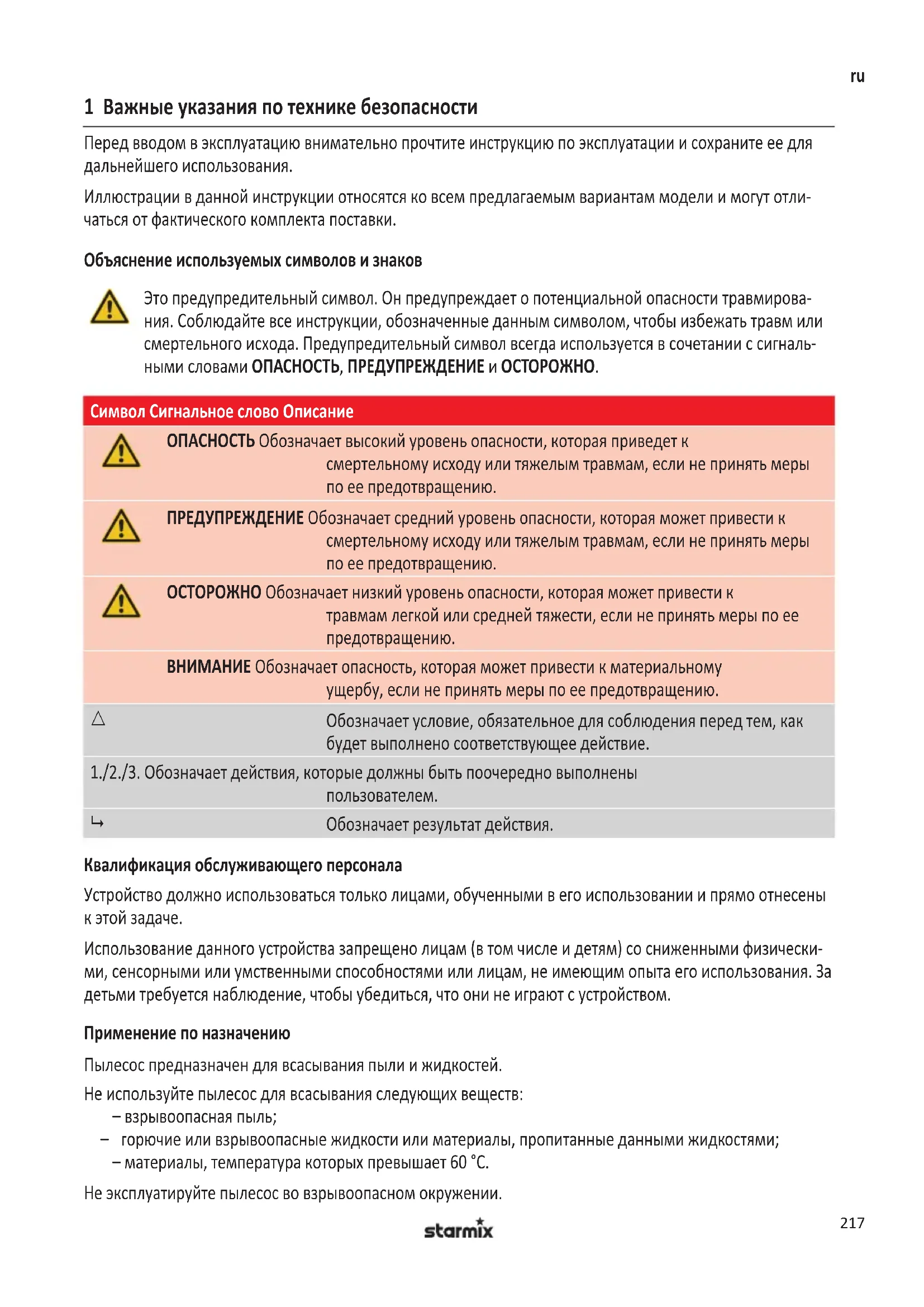 Обозначает результат действия. Квалификация обслуживающего персонала Устройство должно использоваться только лицами, обученными в его использовании и прямо отнесены к этой задаче. Использование данного устройства запрещено лицам (в том числе и детям) со сниженными физически- ми, сенсорными или умственными способностями или лицам, не имеющим опыта его использования. За детьми требуется наблюдение, чтобы убедиться, что они не играют с устройством. Применение по назначению Пылесос предназначен для всасывания пыли и жидкостей. Не используйте пылесос для всасывания следующих веществ: – взрывоопасная пыль; – горючие или взрывоопасные жидкости или материалы, пропитанные данными жидкостями; – материалы, температура которых превышает 60 °C. Не эксплуатируйте пылесос во взрывоопасном окружении. 790749_112015_V03_GA_NSG.indb 217 28.01.2016 09:41:43218